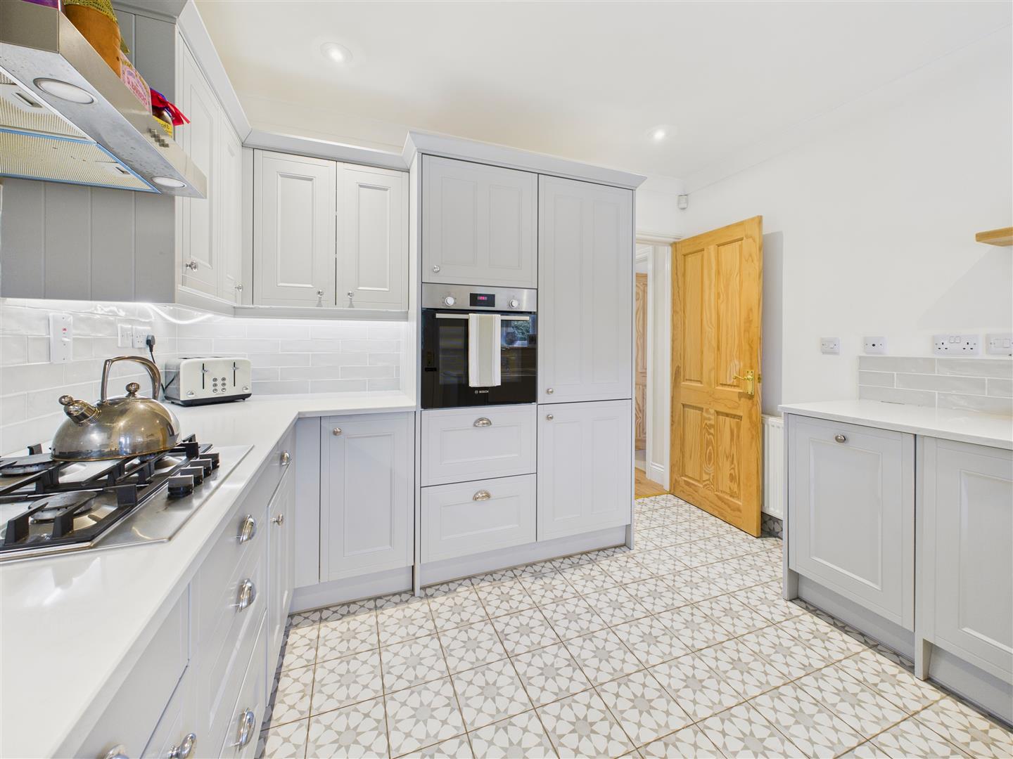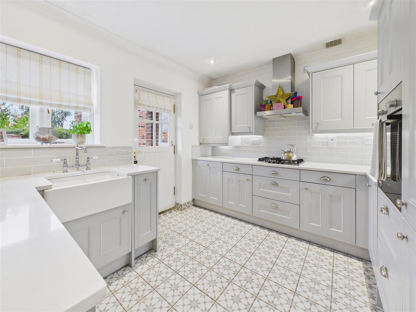 Kitchen - Having an exquisite refitted kitchen with beautiful units, quartz work surfaces and tiled surround. Features include a Belfast style sink with antique style mixer tap, integrated oven, four ring gas hob with extractor hood above, concealed fridge freezer and dishwasher and concealed washing machine. Window and door to rear. Tiled floor.