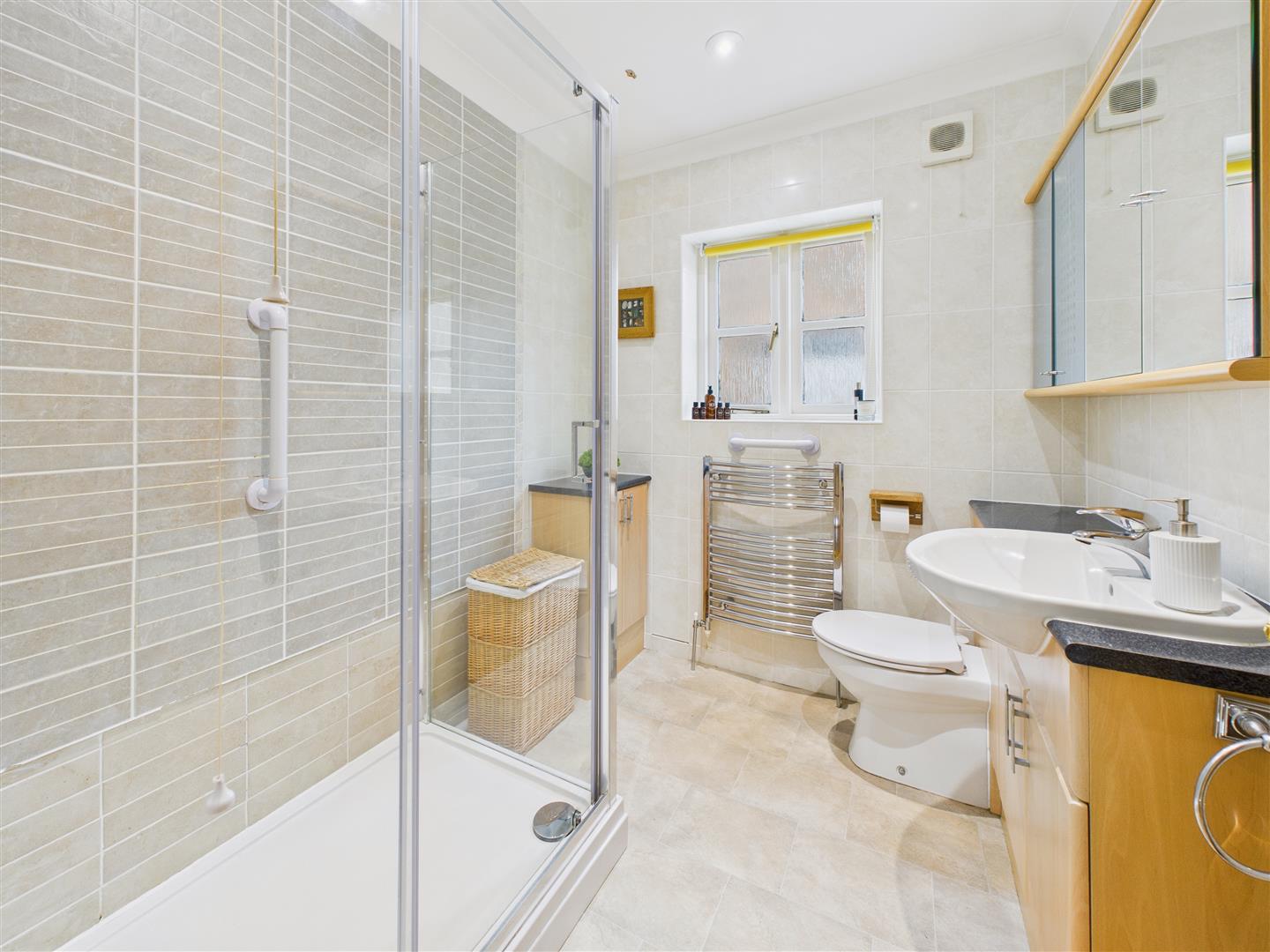 Shower Room - With stylish suite comprising large shower enclosure, fitted furniture with inset wash hand basin and W.C., heated towel rail, tiling to the walls.