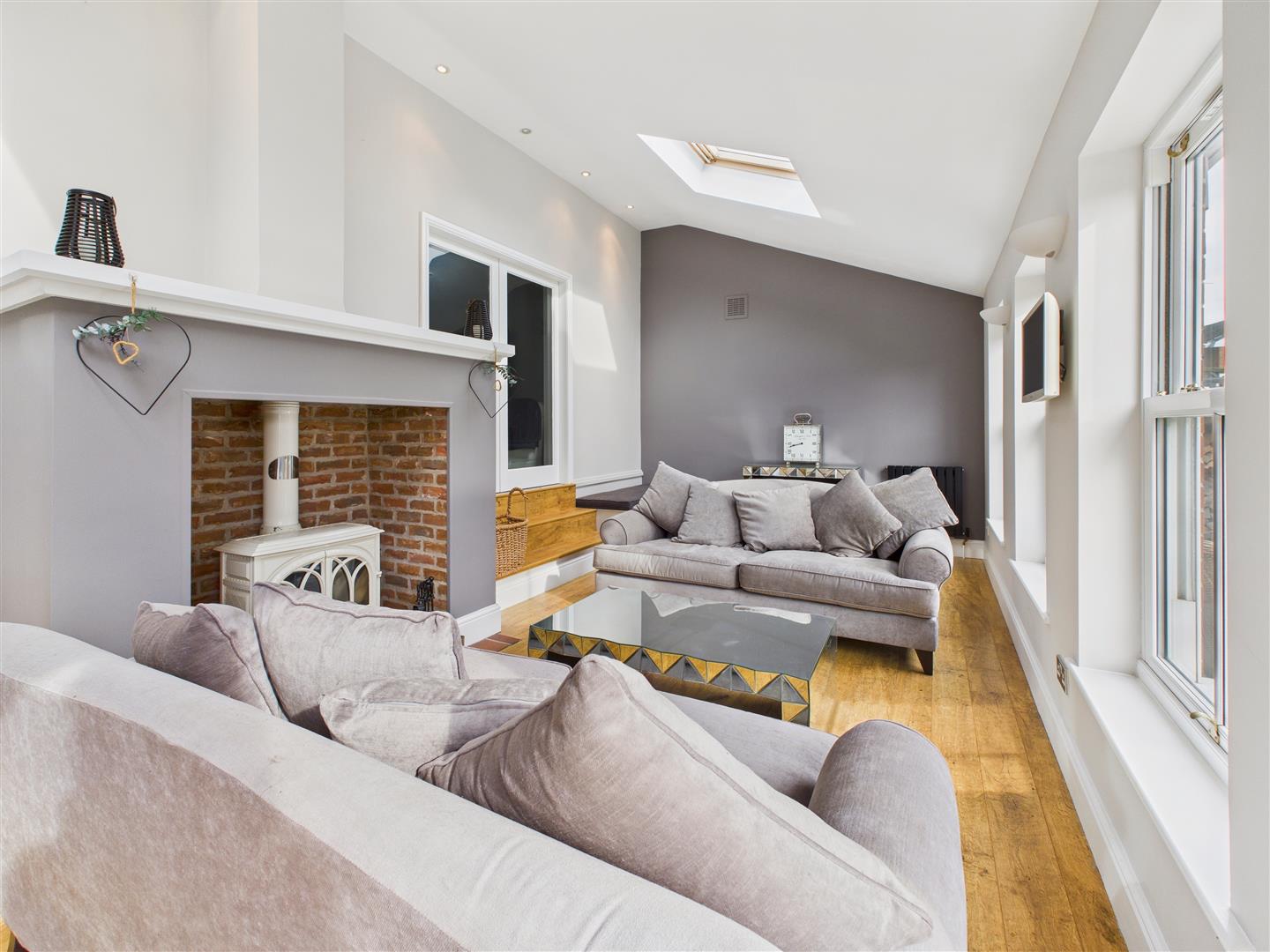 Living Room - 7.92m x 3.71m approx (26'0" x 12'2" approx) - A beautiful room situated to the rear of the house with three windows overlooking the garden plus double doors leading out, two Velux windows to the vaulted ceiling. A central chimney breast houses a solid fuel stove.