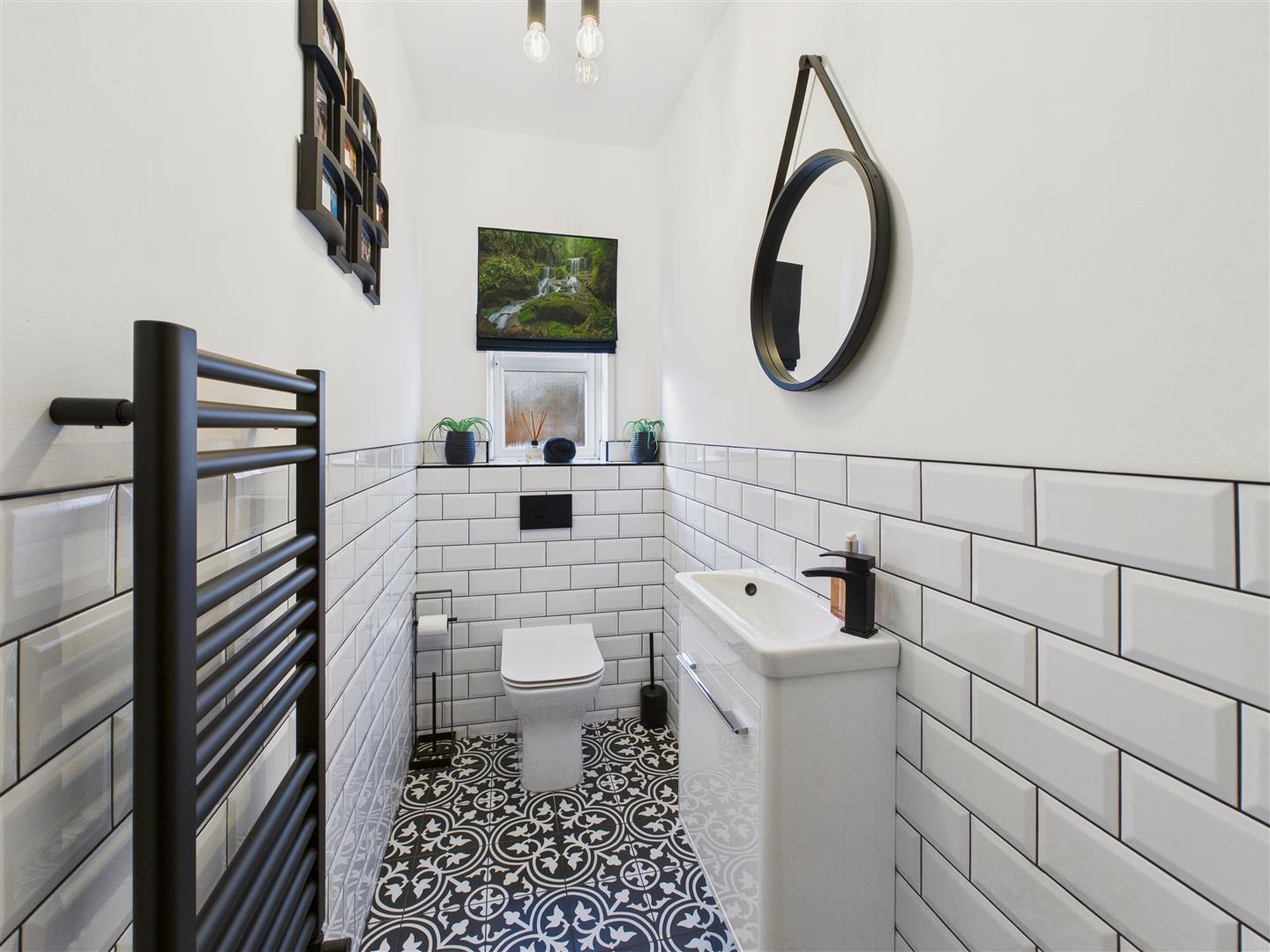 Cloaks/W.C. - Contemporary suite with W.C. and wash hand basin with cabinet heated towel rail and tiled floor.