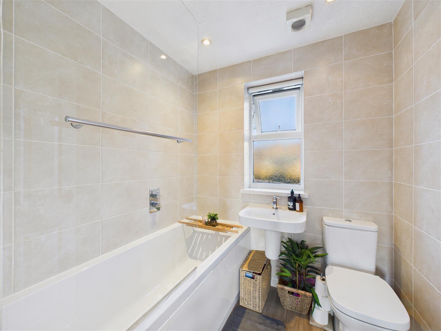 Bathroom - With stylish white suite comprising low level W.C., wash hand basin, panelled bath with shower over and screen, fully tiled walls, heated towel rail.