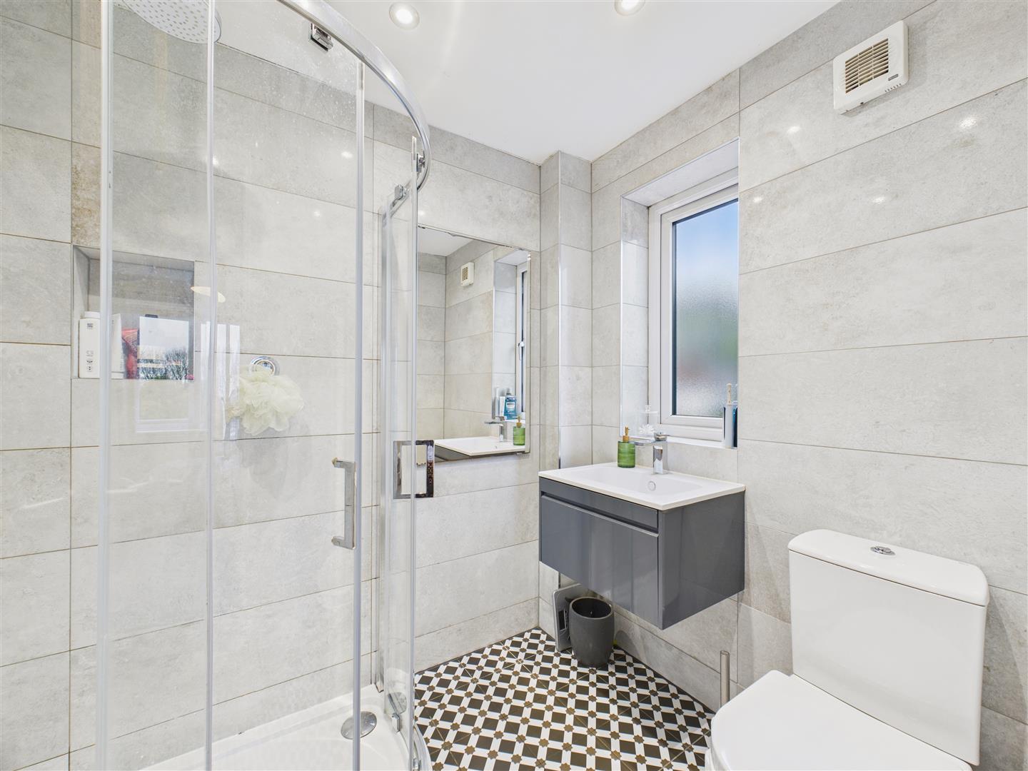 En-Suite Shower Room - With stylish suite comprising of low level W.C., large shower enclosure with rainhead and handheld shower system, wash hand basin in cabinet, tiling to walls and floor.