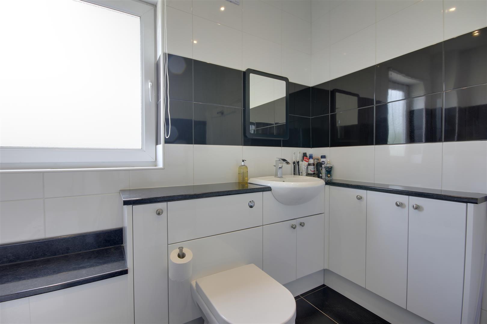 Bathroom - With suite comprising a bath with shower over and screen, vanity unit with wash hand basin and low flush W.C. Tiling to walls and floor. Window to side.