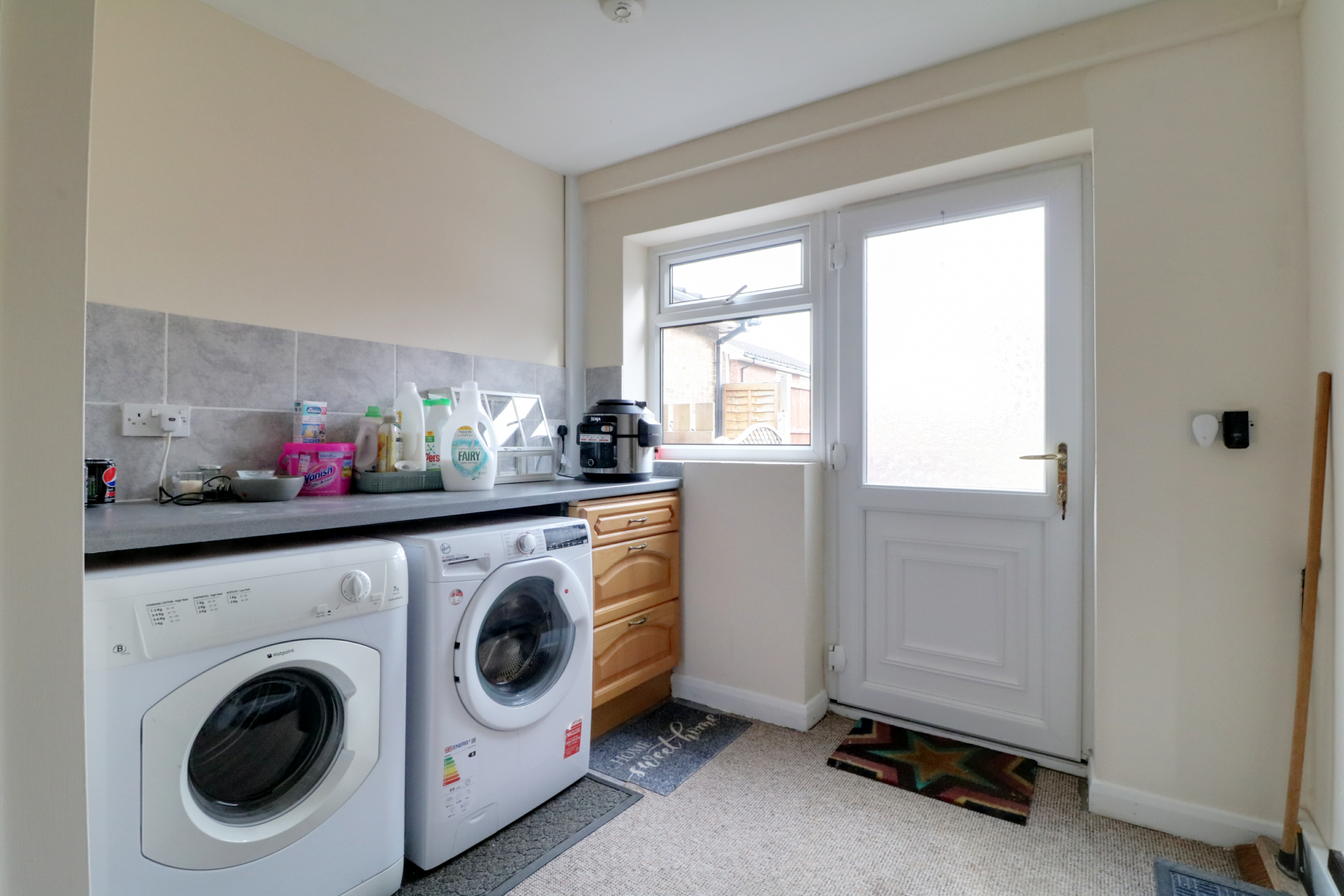 UTILITY ROOM/REAR ENTRANCE 11'6" x 8'5" (3.5m x 2.57m). Enjoying a rear uPVC double glazed window and adjoining entrance door with inset pattern glazing allowing access to the rear, pattered worktop with plumbing beneath for an automatic washing machine, dryer and dishwasher, further space for upright appliances, fluorescent ceiling strip light, tiled effect cushioned flooring and door through to;