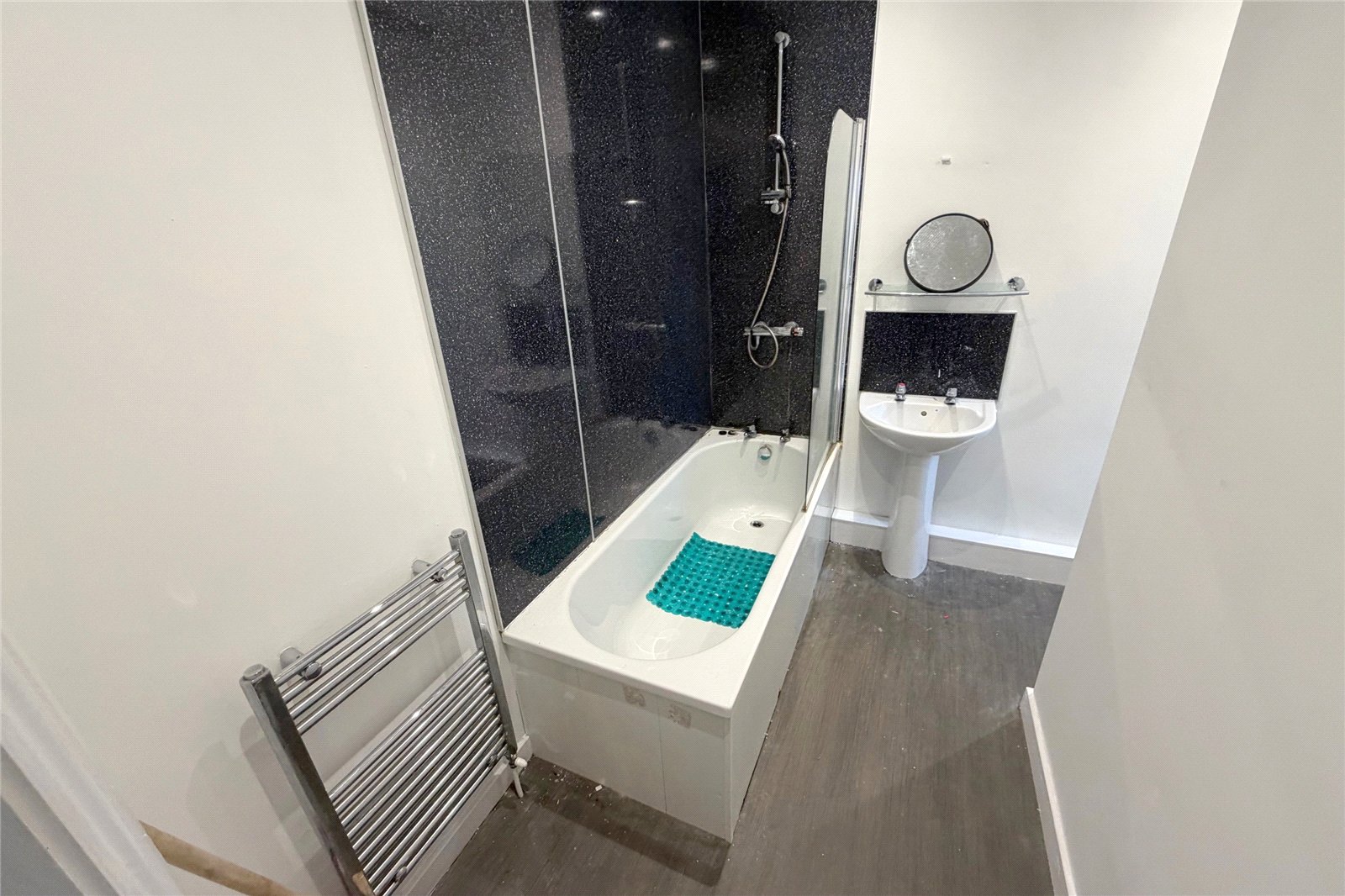 Bathroom 8' x 5' (2.44m x 1.52m). Fitted with a white suite comprising; panelled bath with shower above and a pedestal wash basin, heated towel rail, double glazed frosted window to the side.