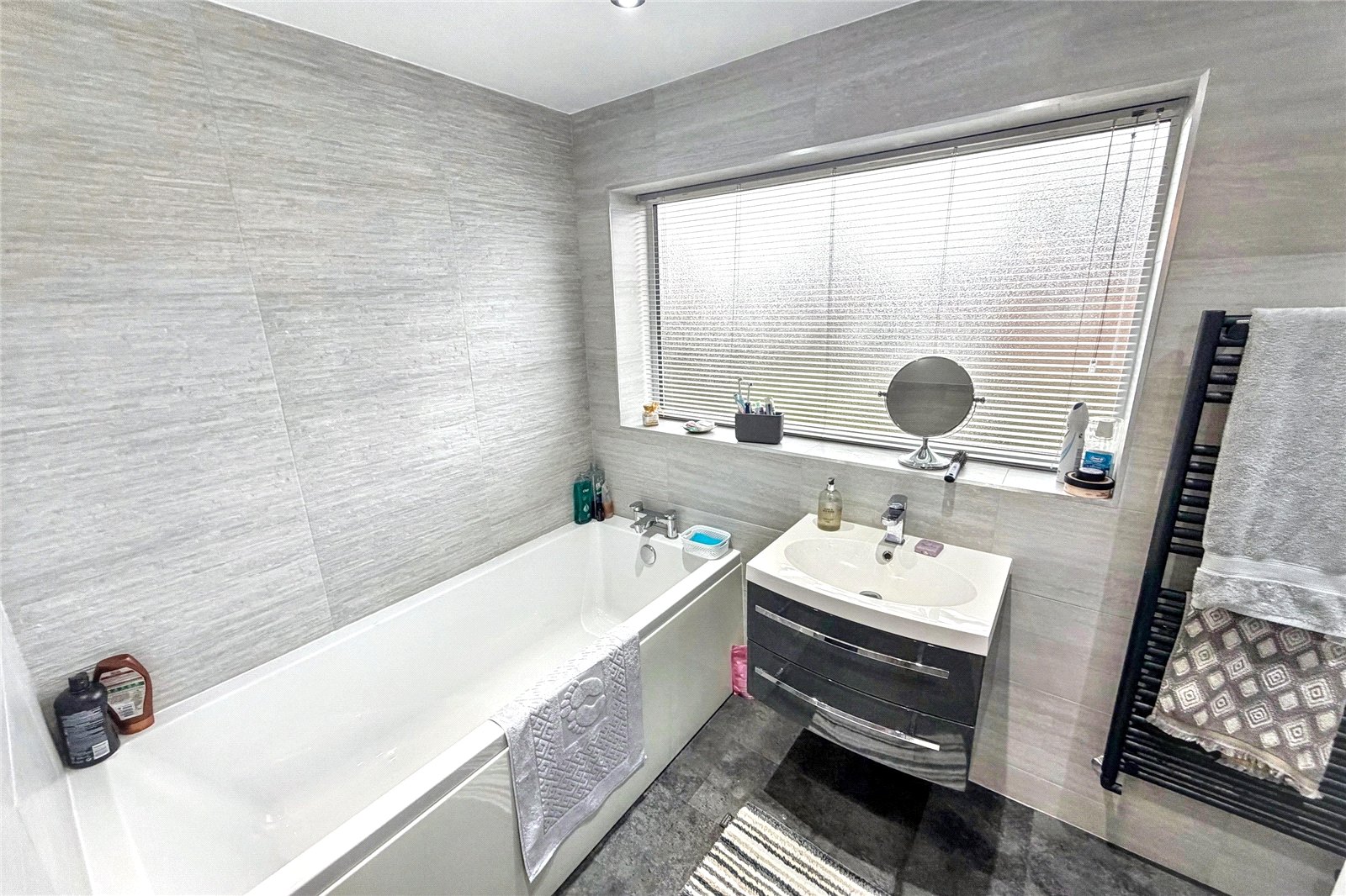 Bathroom/WC 9'11" x 5'10" (3.02m x 1.78m). A superb modern bathroom fitted with a white suite comprising; panelled bath, separate shower cubicle, low level WC and wash basin, heated towel rail, tiled walls and Karndean flooring. Double glazed frosted windows to the rear.