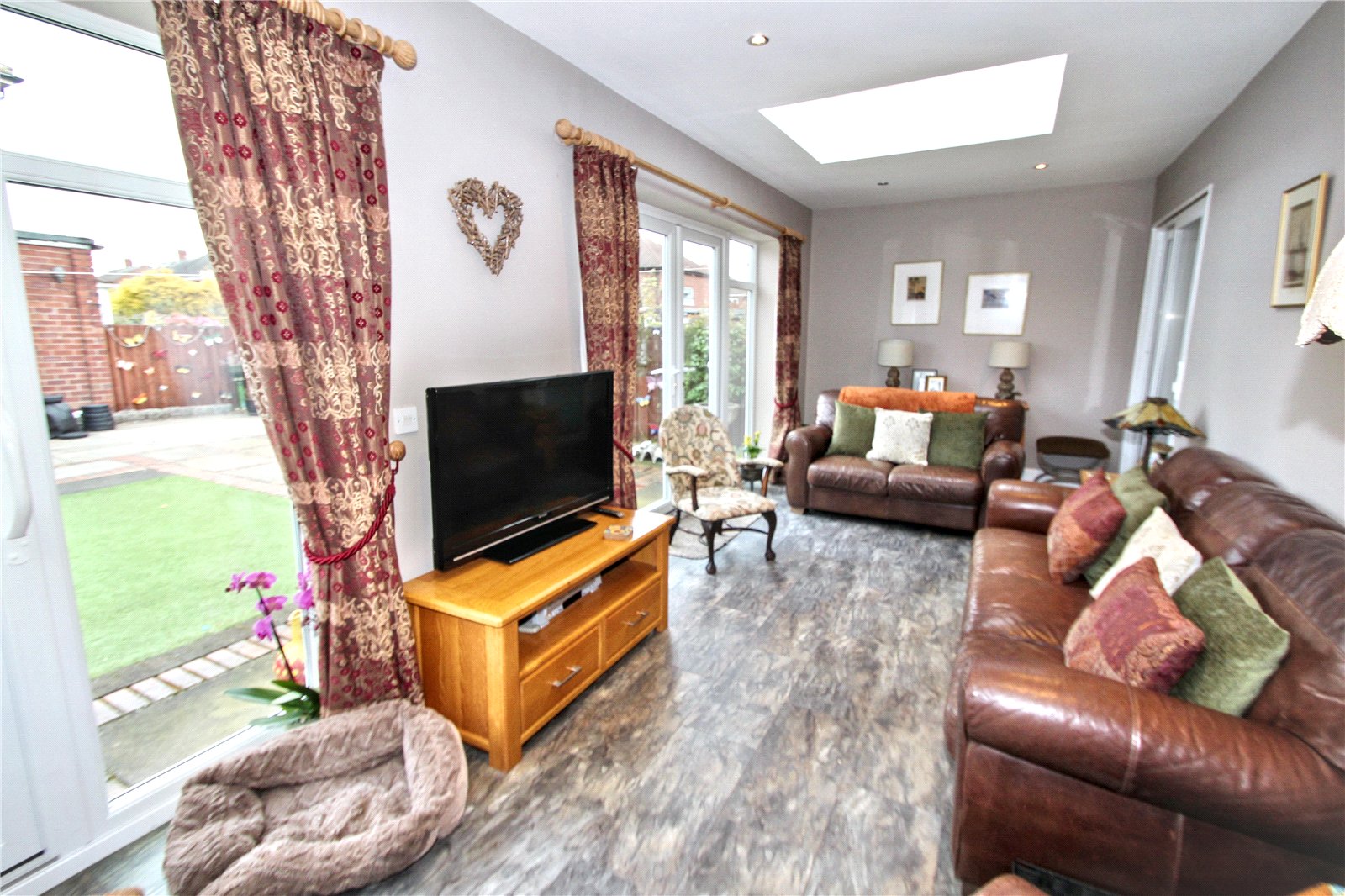 Sitting Room 20' x 10'6" (6.1m x 3.2m). A spacious family sitting room creating a light and airy space with twin feature windows and two sets of French doors giving access to rear garden. Matching feature flooring (with underfloor heating), TV point, spot lights and sky light. Open plan to Breakfasting Kitchen.