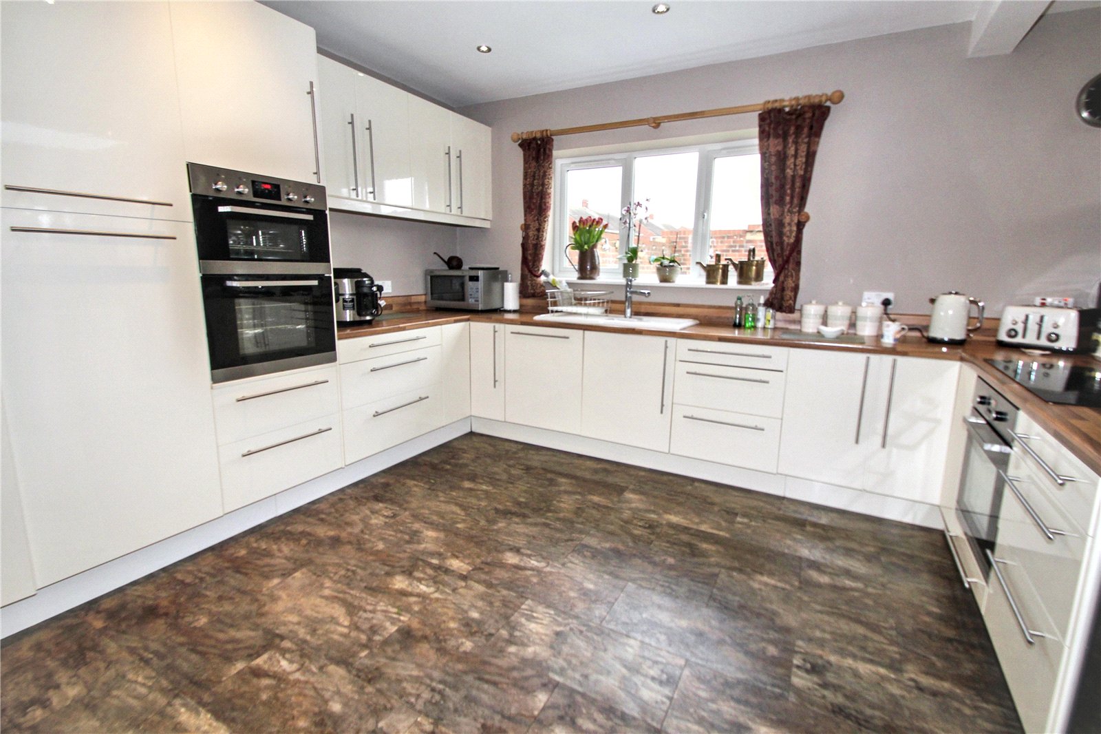 Breakfasting Kitchen 13'10" x 13'7" (4.22m x 4.14m). A fabulous dining kitchen with extensive range of high gloss wall and floor units, wood block style worktops, colour co-ordinated single drainer sink unit, built-in electric hob and oven, additional double oven, space for fridge/freezer, breakfast bar, spot lights and double glazed window (with venetian blinds).