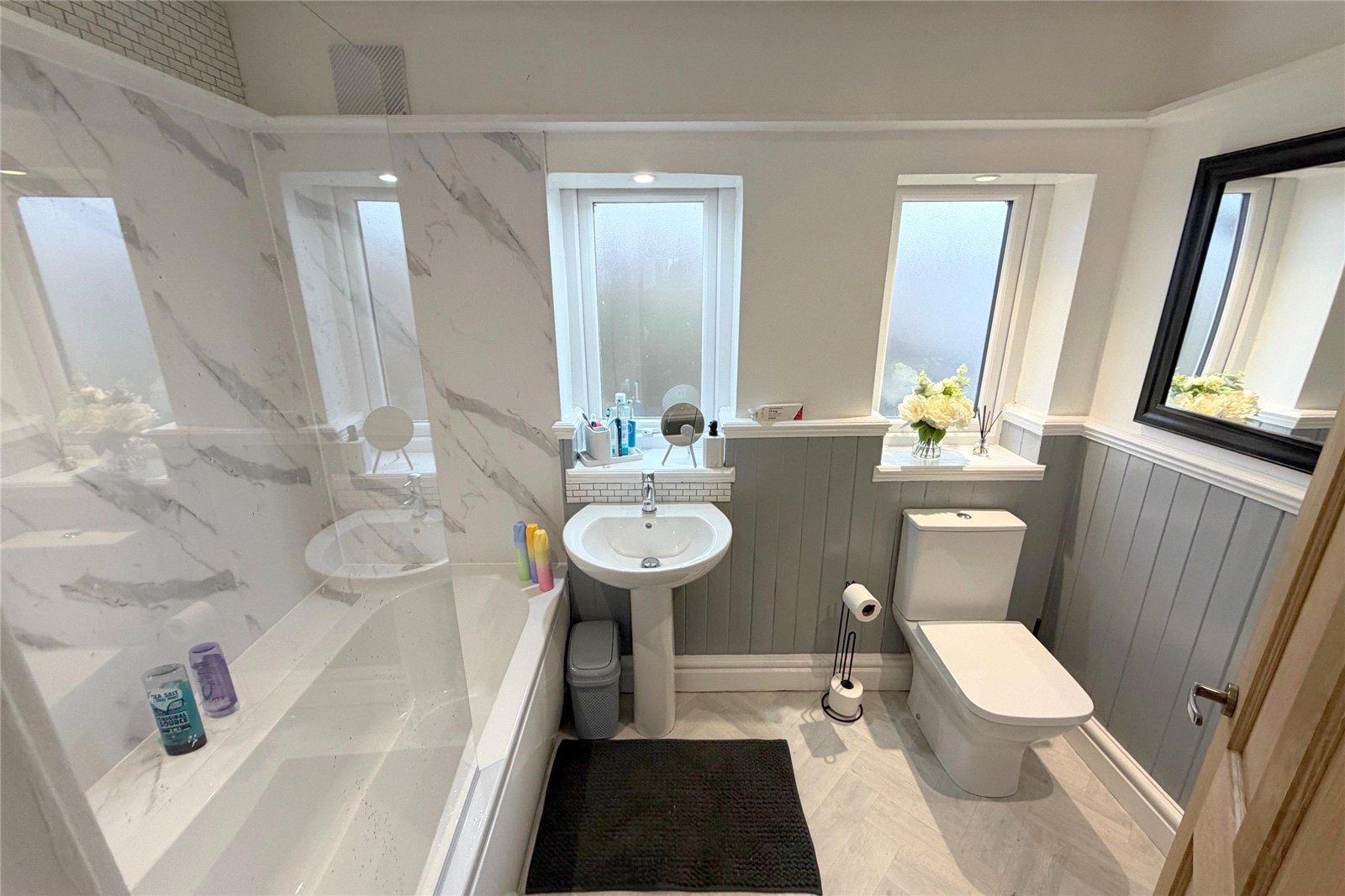 Bathroom/WC 8'10" x 5'6" (2.7m x 1.68m). A modern bathroom/WC fitted with a white suite comprising; panelled bath with shower above, low level WC and wash basin. Heated towel rail. Two double glazed frosted windows to the rear.