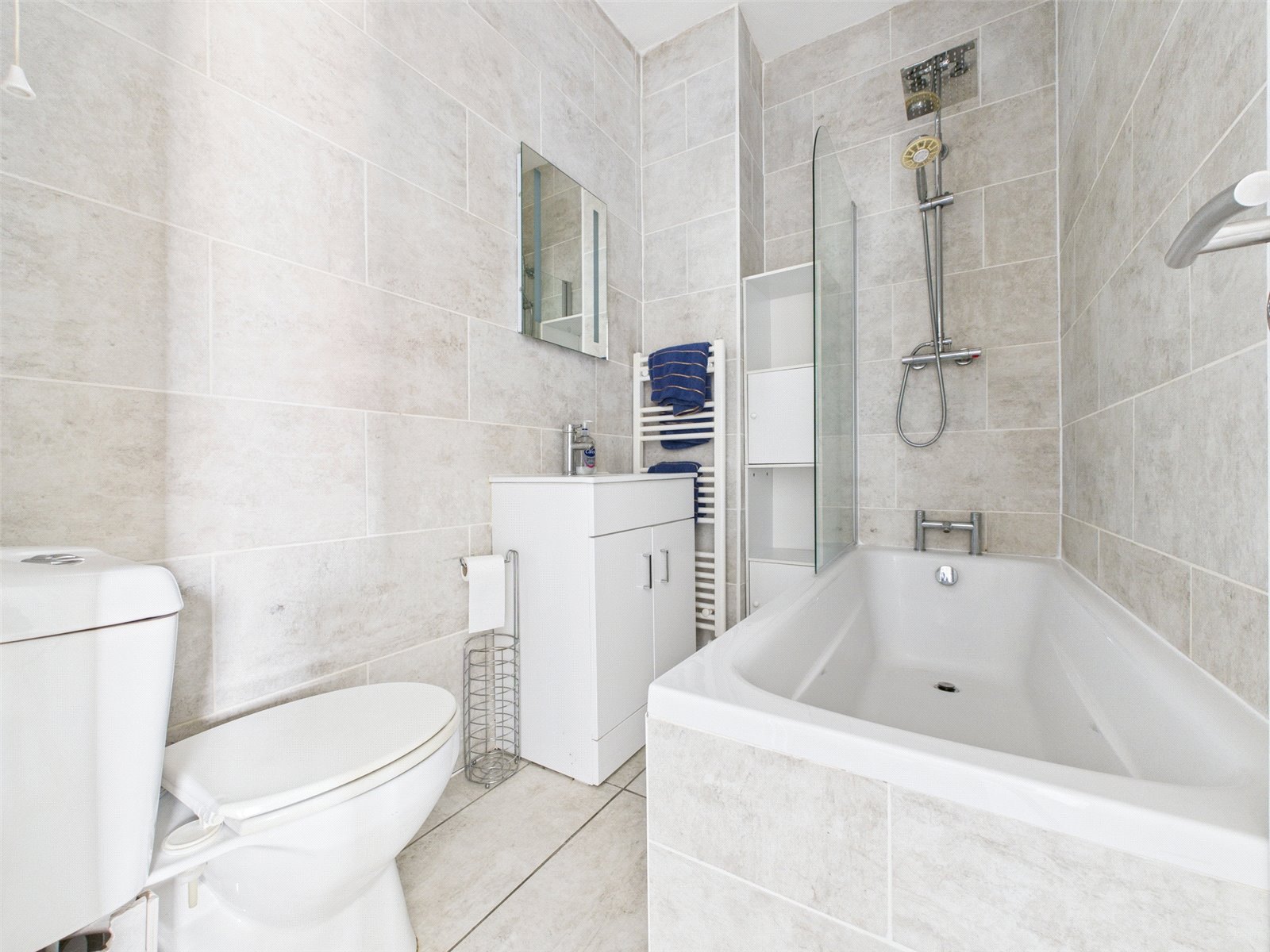 - A bathroom with shower over bath