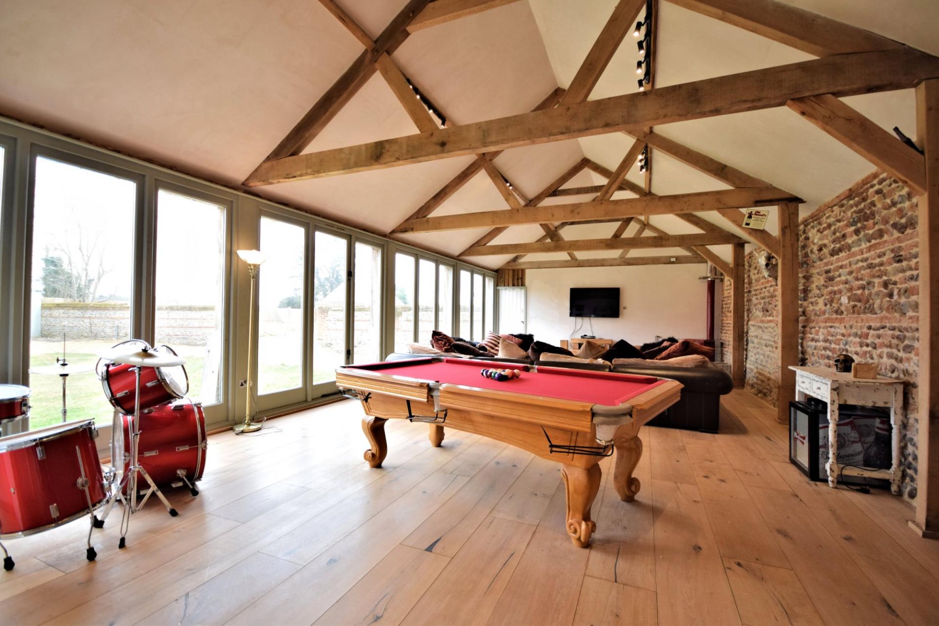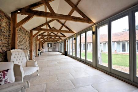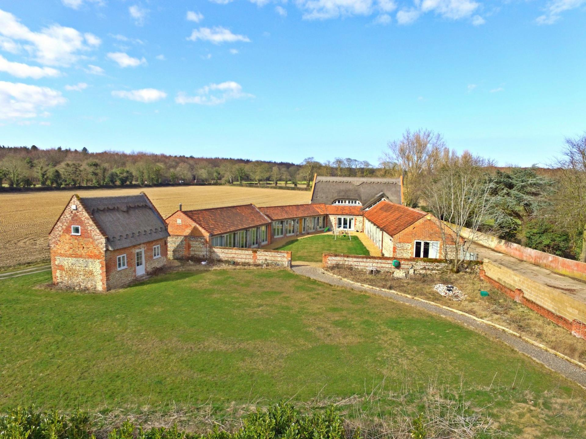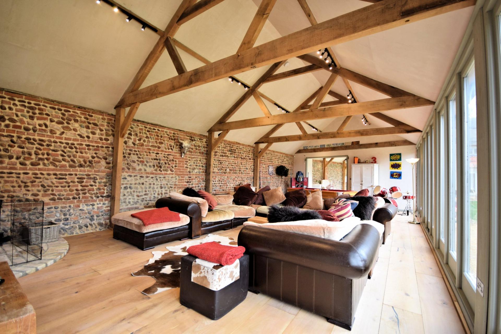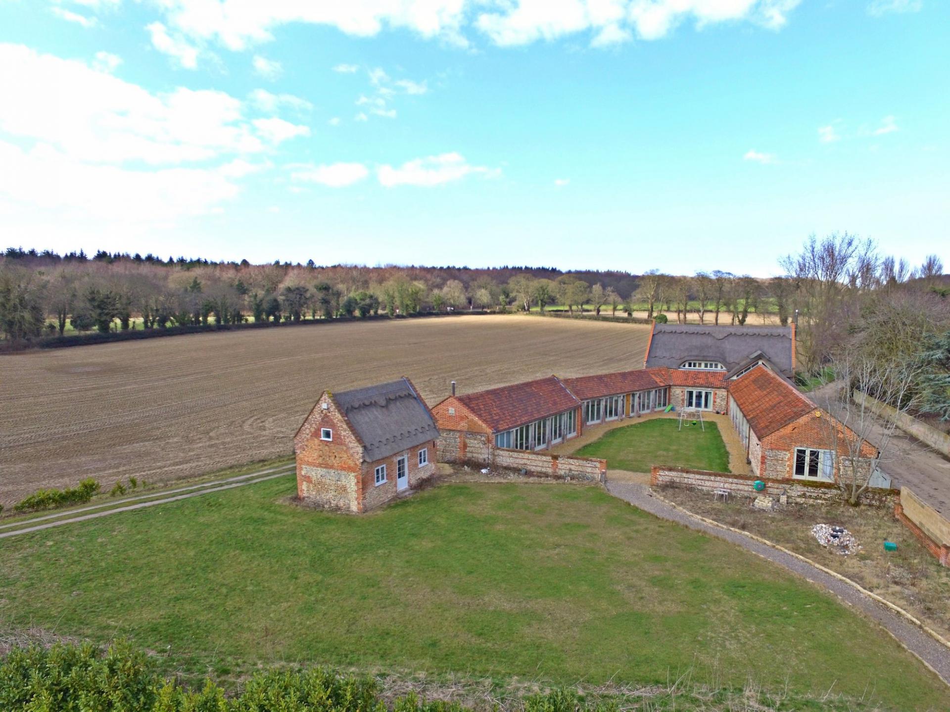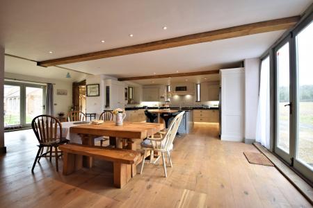 A stunning barn conversion offering over 5500 sq ft of accommodation set in semi undulating countryside with views over open farmland and surrounding woodland no near neighbours. The property boasts an abundance of natural light, exposed timbers, spacious rooms and benefits from a ground source heat pump. The attention to detail within this conversion is excellent. From the moment you enter this barn you get a great sense of space. Features include engineered oak flooring, French limestone, black limestone and underfloor heating, not to mention the exposed timbers and flint and brick walls. The vaulted accommodation is set over two floors and comprises an impressive reception hall with floor to ceiling windows, overlooking the inner courtyard. A stunning open plan sitting room with a wood burner and a bespoke fitted kitchen with granite worktops and an Aga. The reception hall wing continues in to a fine sitting room with a wood burner and access to a study. The bedroom wing comprises three bedrooms, a fabulous shower and bathroom, gym, utility room and boiler room. The first floor is access via a bespoke made solid oak staircase. This floor serves three en suite bedrooms.
