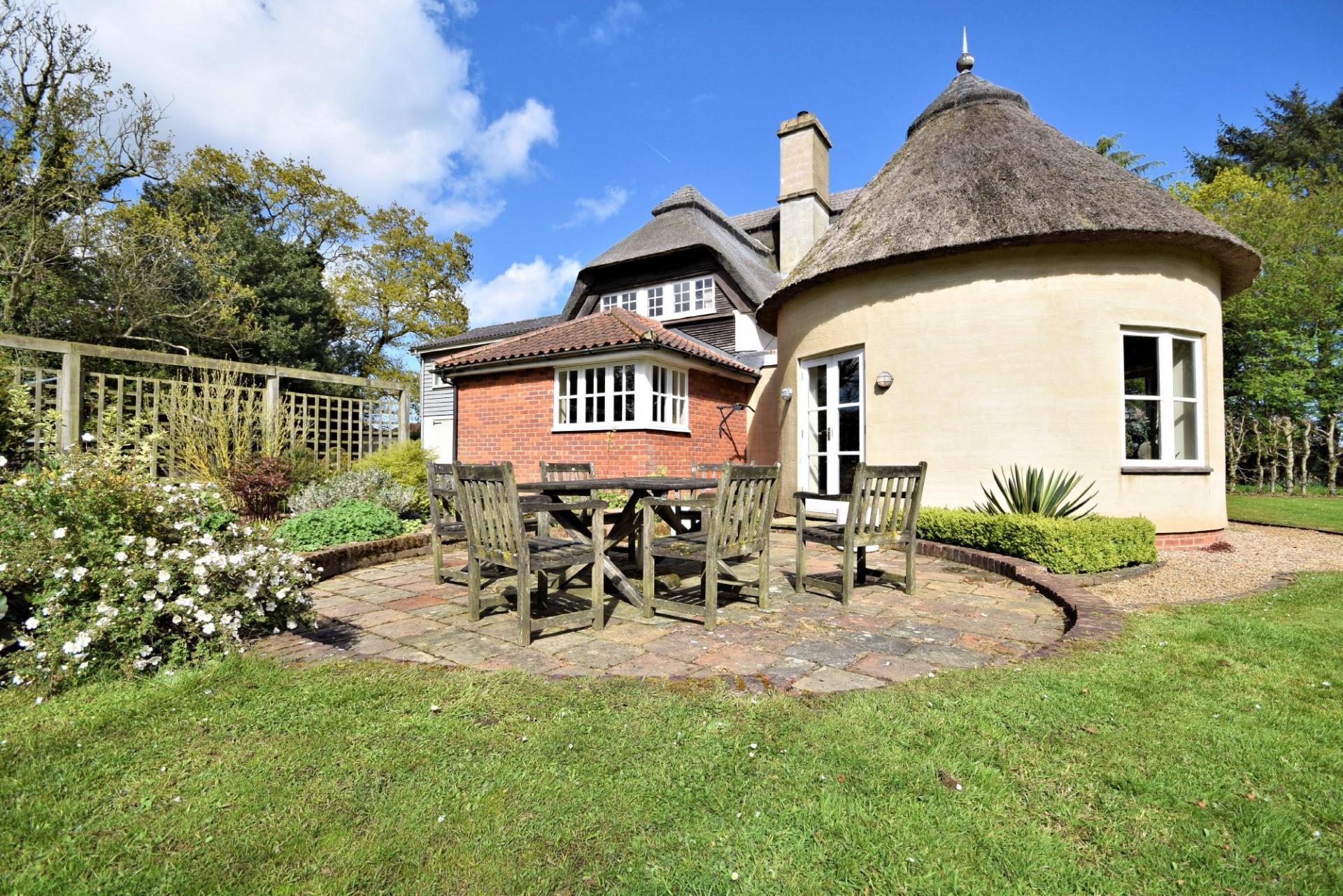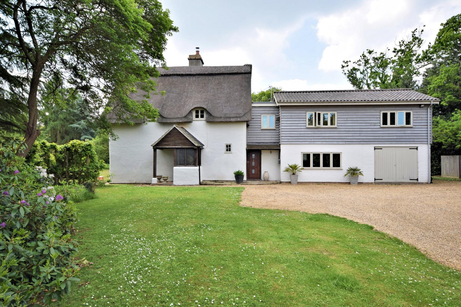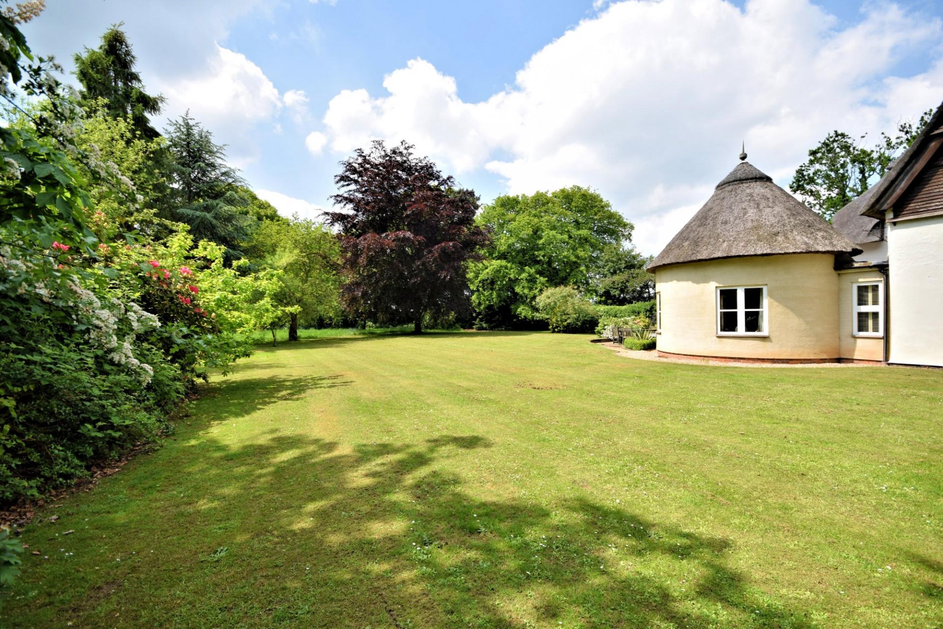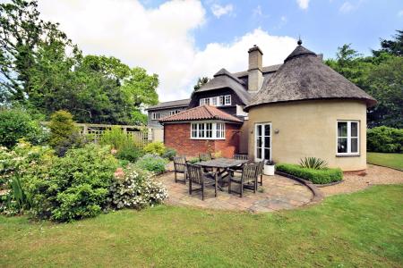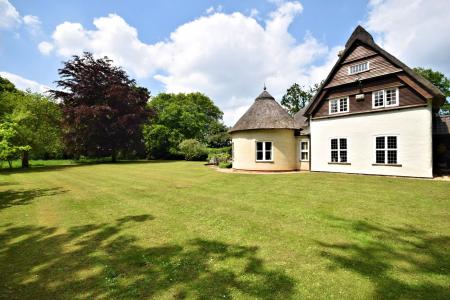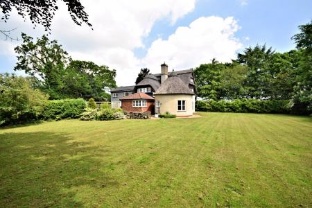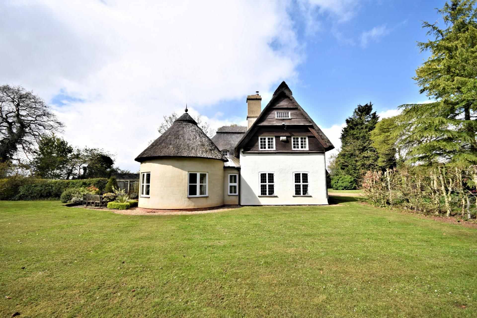 Ollands is a delightful Art's & Crafts property that was built in 1921 with later additions. The original property was constructed of Pise De Terre under a thatched roof. The property has been sympathetically extended in the 60's and more recently by the current owners to create an impressive circular reception room under a thatched roof. The property boasts a selection of period features that include wooden doors with hand carved latches in an Arts & Crafts style, leaded light windows and a fine dated 1921 ceiling timber to the sitting room. The accommodation is set over two floors and comprises a fine entrance staircase hall with access to the rear and to a pantry. There is a useful study to the front with a cloakroom, boiler room and access to a garage with front and rear double doors. The drawing room boasts a fine fireplace, leaded light windows and french doors leading to the kitchen/breakfast and family room. The kitchen is well fitted with a range of wall and base level units, a breakfast bar and a corner window that provides lovely views over the garden. The impressive addition of the circular family room provides a sociable seating area, good views of the garden and french doors that lead out.