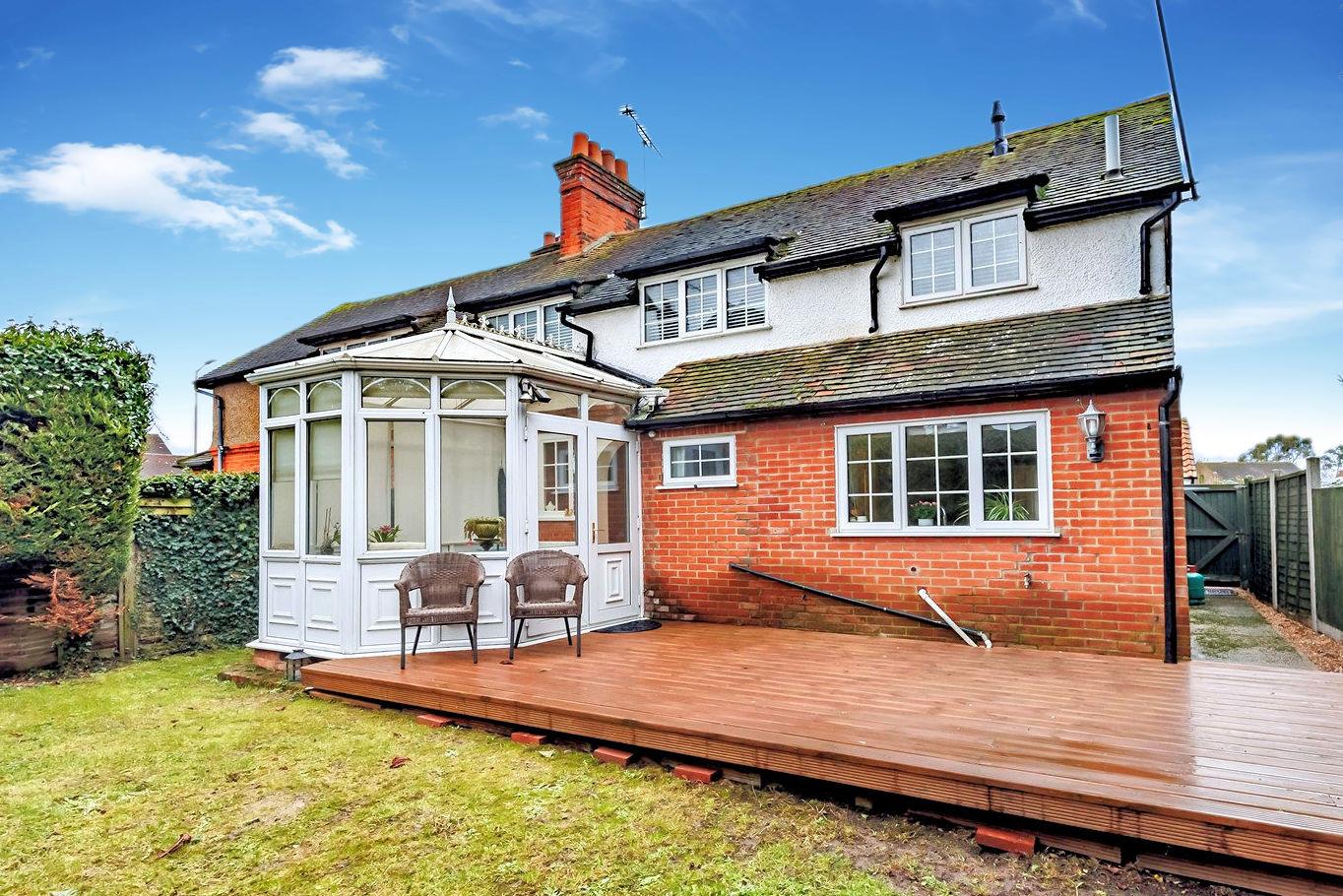 The first-floor boasts four comfortable bedrooms with bedroom one have and range of fitted wardrobes and cupboards. The family bathroom features a four-piece suite finished with white sanitary ware and fully tiled walls, creating a delightful retreat that adds a touch of grandeur. Outside, the private garden features a lush lawn and a raised wooden decked veranda, offering the perfect setting for outdoor dining or play. A handy side entrance leads to the front via a gated access. This home is ideal for families or anyone seeking both space and seclusion.