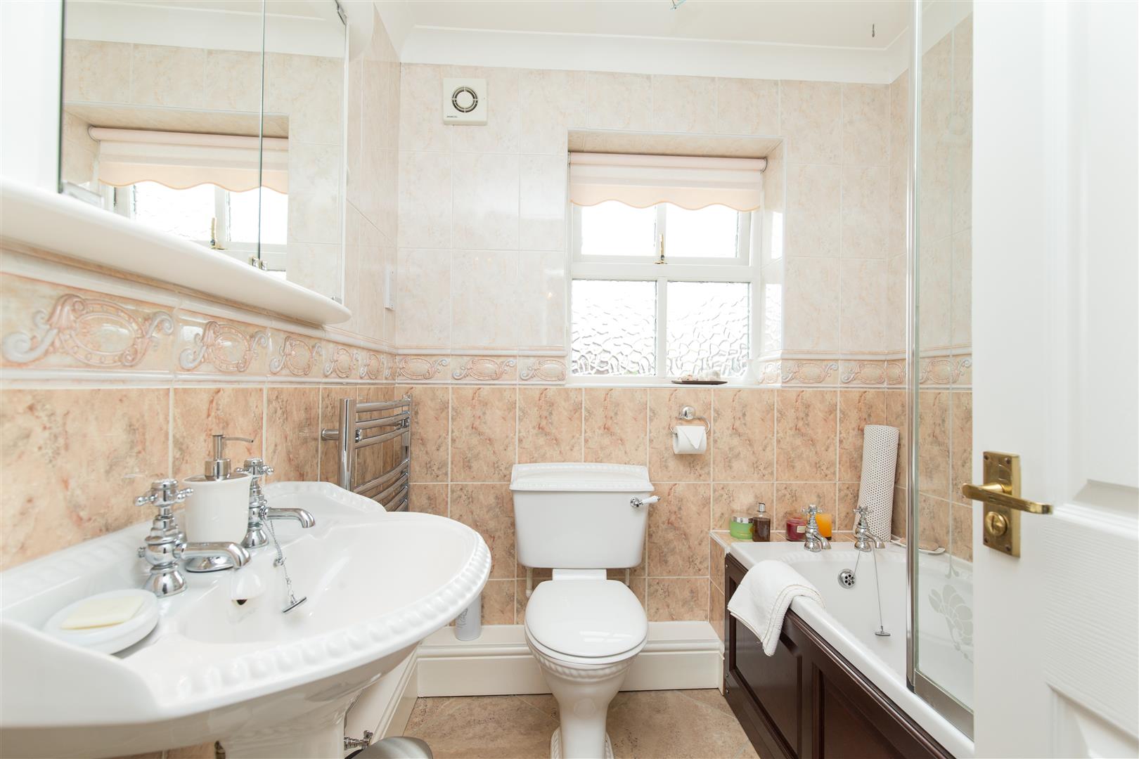 Bathroom - 2.03m x 1.91m (6'8" x 6'3") - Fully tiled walls and flooring with shower and screen over a straight panelled bath, pedestal wash hand basin and low flush WC. Extractor, shaver point, chrome central heated towel warmer and a double-glazed frosted window.