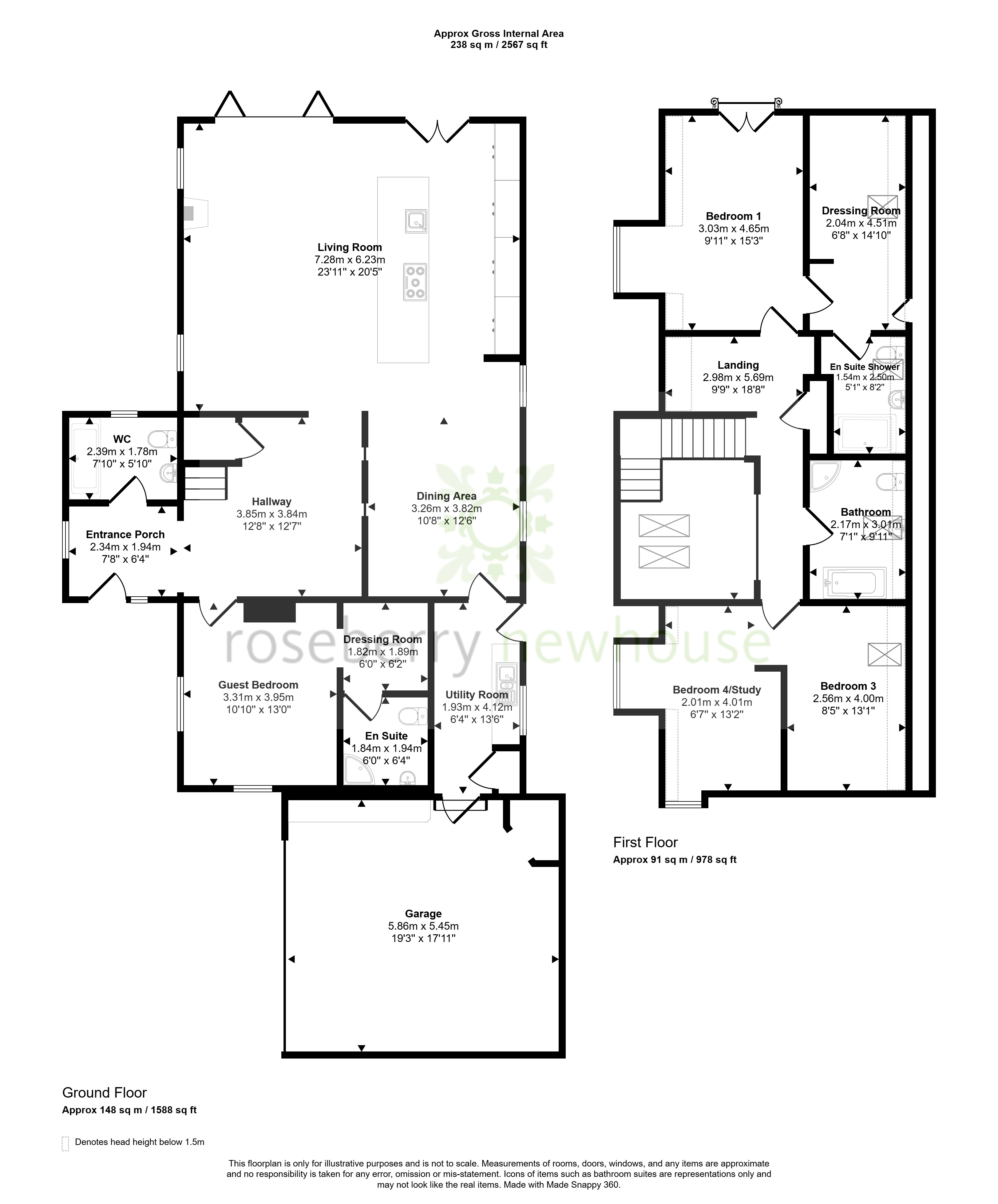 Also on the ground floor, a generously proportioned guest bedroom offers both privacy and comfort, featuring a bespoke dressing room and a contemporary en suite shower room.