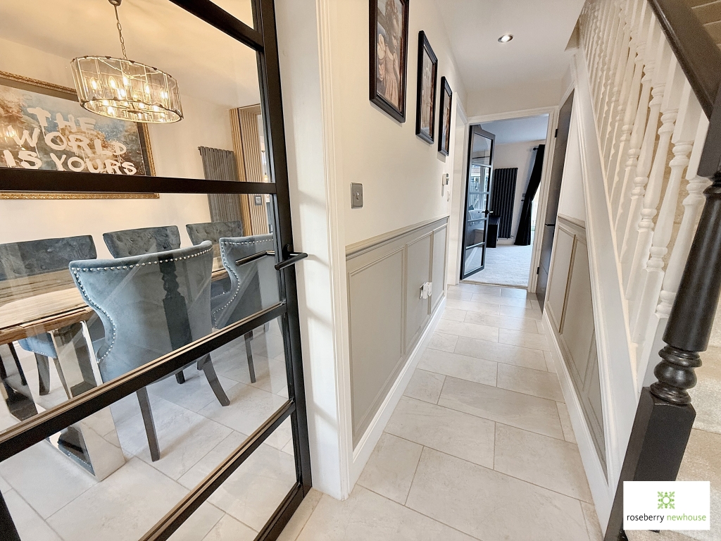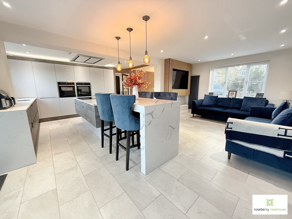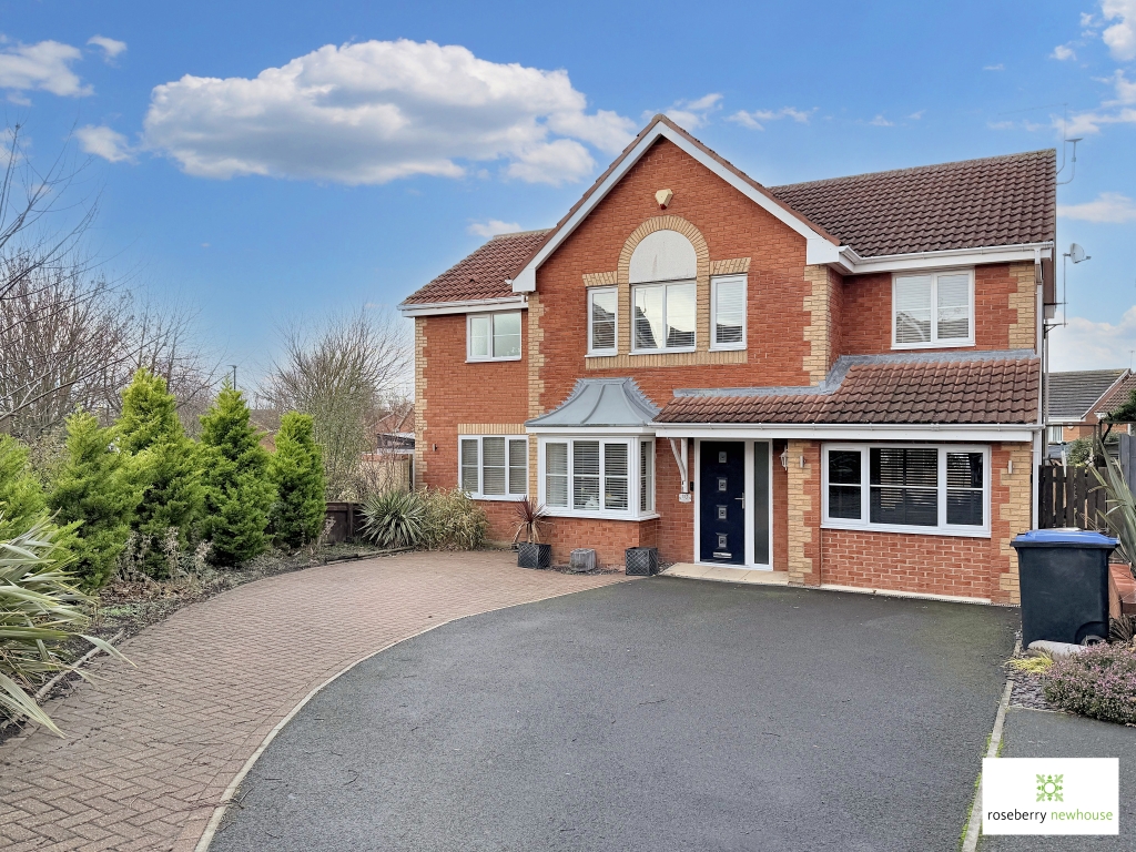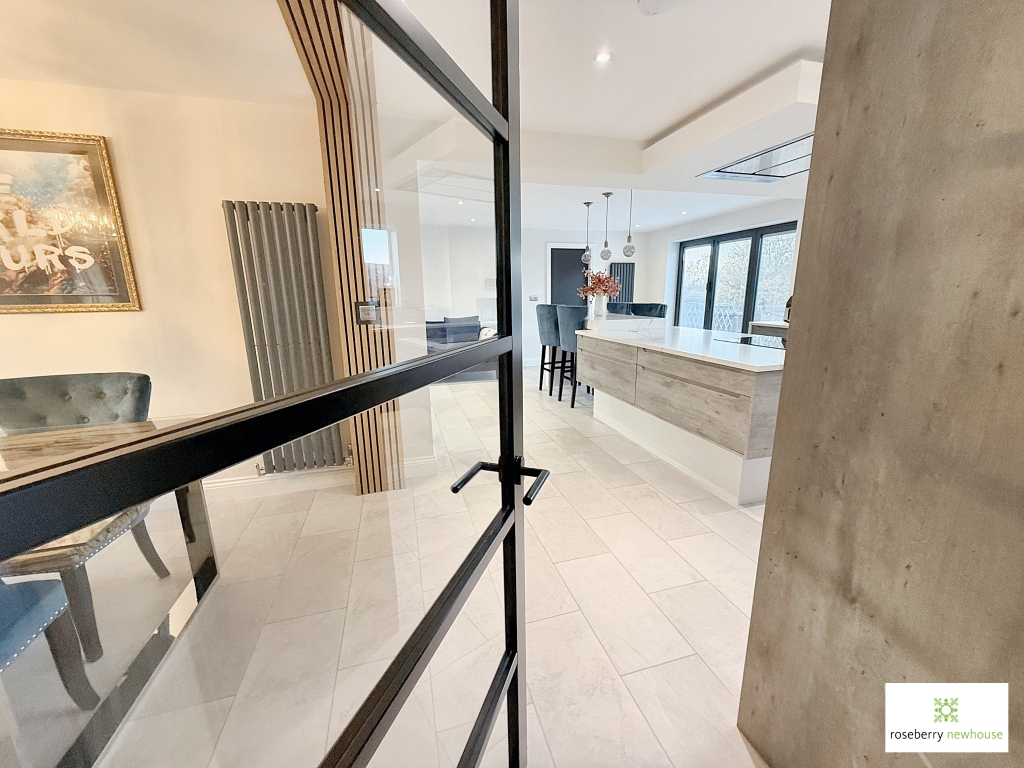 Set within a quiet Guisborough cul-de-sac, 10 Woodale Close is an executive five-bedroom home that has been thoughtfully extended and styled to create generous, modern family living. A wide, panelled hallway sets the tone, with Crittall-style internal doors drawing you through to a refined living room where the media wall and sleek panelling balance comfort with contemporary design. The true hub of the house is the open-plan kitchen, family and dining space—an impressive, light-filled room finished with large-format tiling, a statement central island, quartz worktops and a bank of integrated appliances. Broad glazing opens to the garden, making everyday life and entertaining effortless. A separate snug/sitting area offers a calm retreat, while a practical utility room and cloakroom complete the ground floor.
