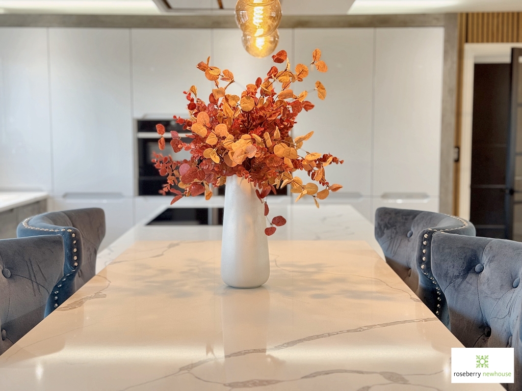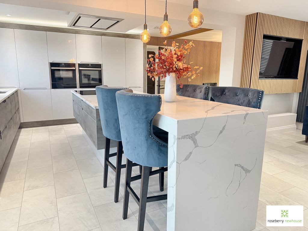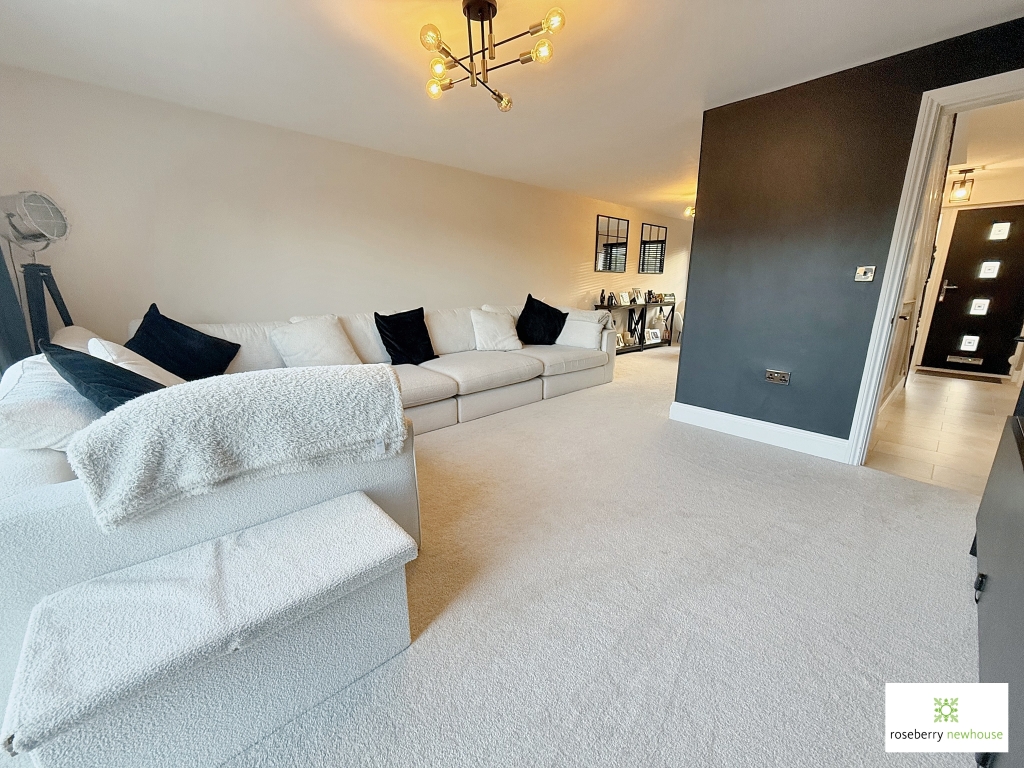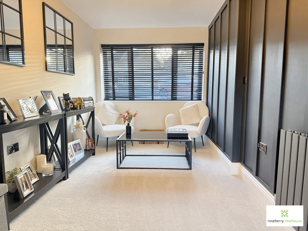 Set within a quiet Guisborough cul-de-sac, 10 Woodale Close is an executive five-bedroom home that has been thoughtfully extended and styled to create generous, modern family living. A wide, panelled hallway sets the tone, with Crittall-style internal doors drawing you through to a refined living room where the media wall and sleek panelling balance comfort with contemporary design. The true hub of the house is the open-plan kitchen, family and dining space—an impressive, light-filled room finished with large-format tiling, a statement central island, quartz worktops and a bank of integrated appliances. Broad glazing opens to the garden, making everyday life and entertaining effortless. A separate snug/sitting area offers a calm retreat, while a practical utility room and cloakroom complete the ground floor.
