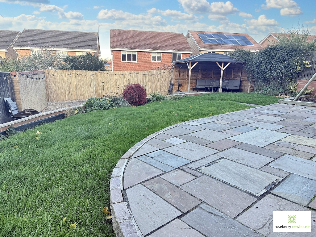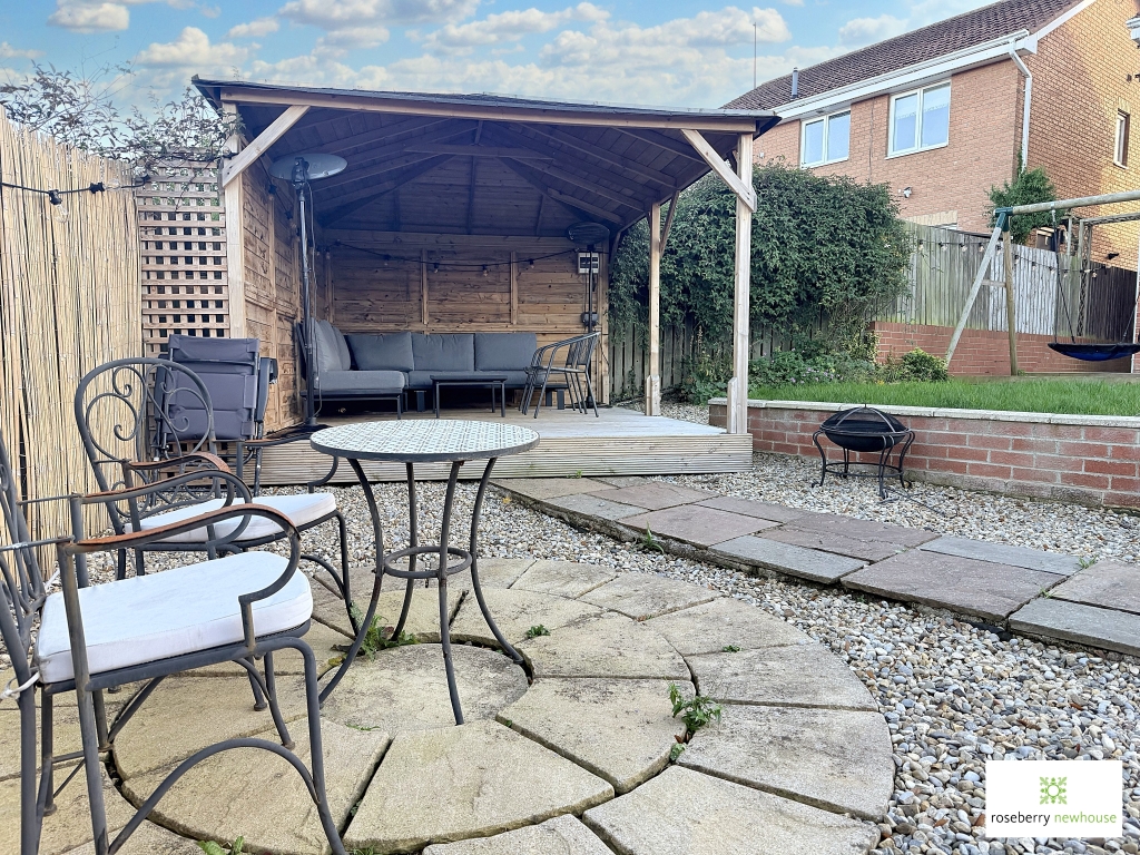 Outside, the property occupies a desirable corner plot with excellent frontage and driveway parking for several vehicles. To the rear, landscaped gardens provide zoned spaces for play and relaxation, including a broad terrace and a covered seating area framed by lawn and planting—perfect for year-round use. A polished, move-in-ready home with space, style and flexibility in a prime residential setting.