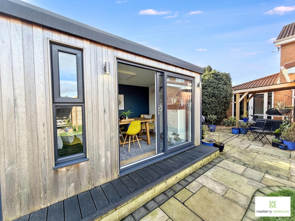 Externally, a double driveway provides off-road parking and access to the integral garage. To the rear, the property truly excels. The garden has been professionally landscaped to create a superb outdoor entertaining environment, featuring terraced seating areas, a lawn, covered terrace, and an outdoor kitchen space—ideal for hosting friends and family. A standout feature is the garden office pod, complete with electricity and WiFi, making it perfectly suited for home working, a studio, gym or entertaining space.