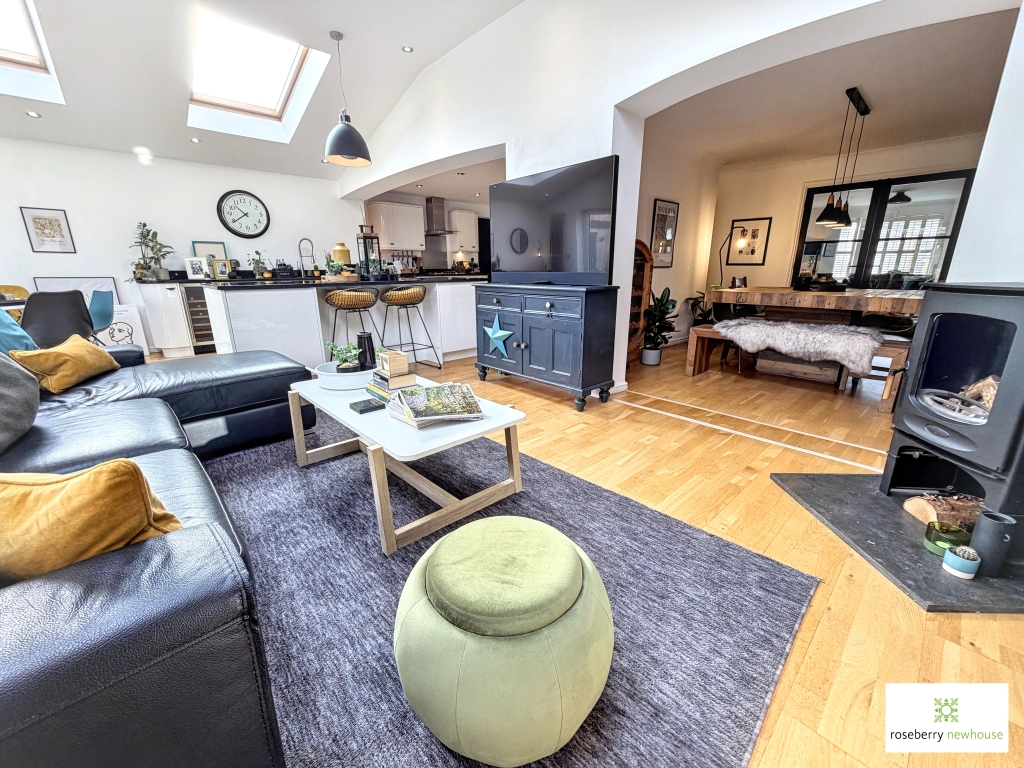 Crittall-style internal double doors lead through to the heart of the home — an impressive extended dining and family space with a vaulted ceiling and freestanding log burner, creating a dramatic yet inviting setting for both family living and entertaining. This space flows seamlessly into the modern kitchen, complete with a central island, integrated appliances and a separate laundry area, all finished with contemporary cabinetry and quality work surfaces. Extensive glazing floods the room with natural light and connects the interior effortlessly with the garden beyond.