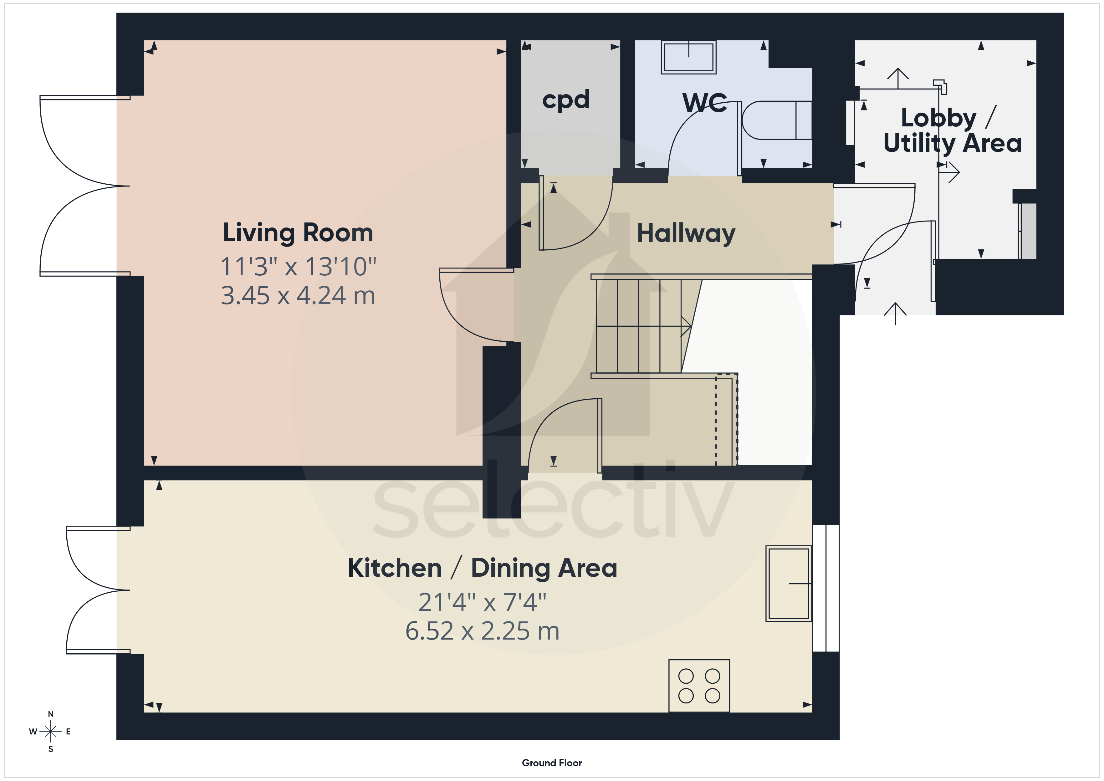 The ground floor features a rear-facing lounge with double opening French doors leading out to the courtyard garden, while to the front you’ll find a spacious kitchen / dining area stretching over 21ft — providing plenty of room for cooking, dining and entertaining.