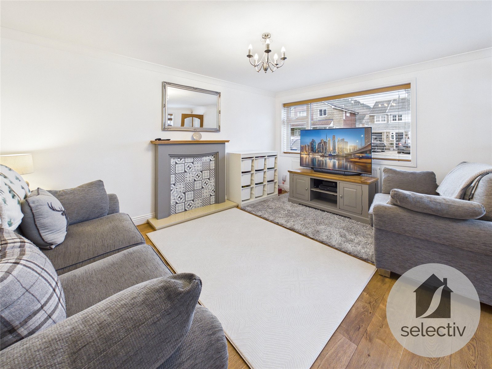 The welcoming living room to the front elevation is bright and well-proportioned, finished in modern neutral tones with a contemporary feature fireplace creating a cosy focal point.