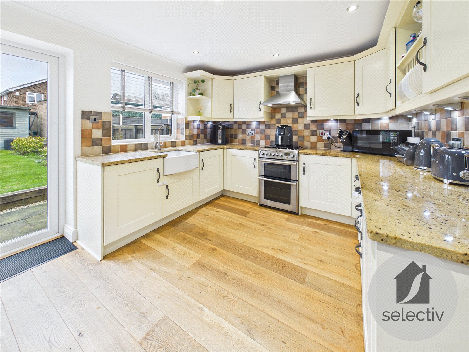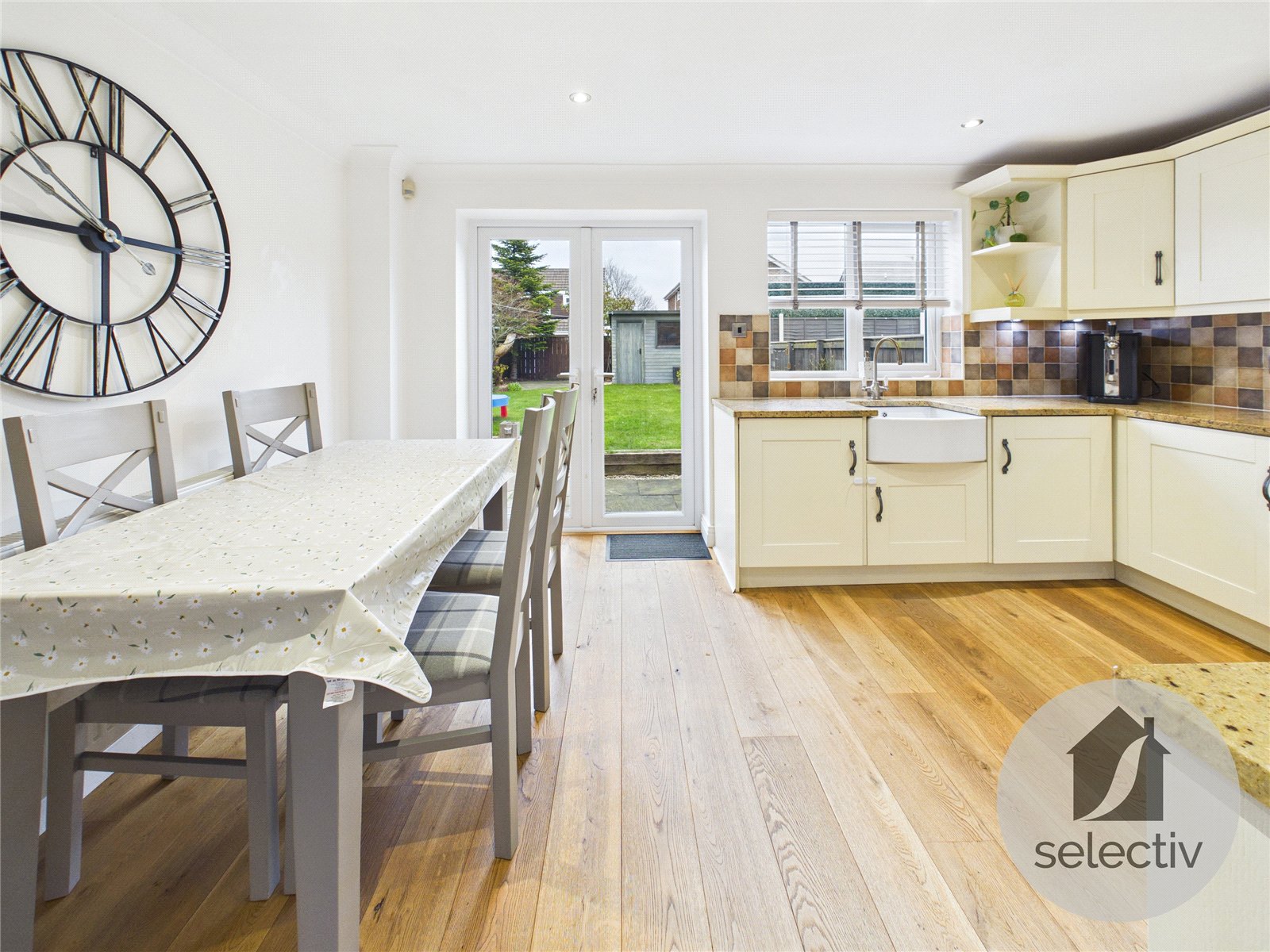 To the rear, the kitchen / dining area forms the heart of the home. Fitted with a range of stylish wall and base units, generous worktop space and a farmhouse-style sink, the layout flows effortlessly into the dining area. French doors open directly onto the rear garden, creating an ideal space for entertaining, summer evenings or relaxed family living.