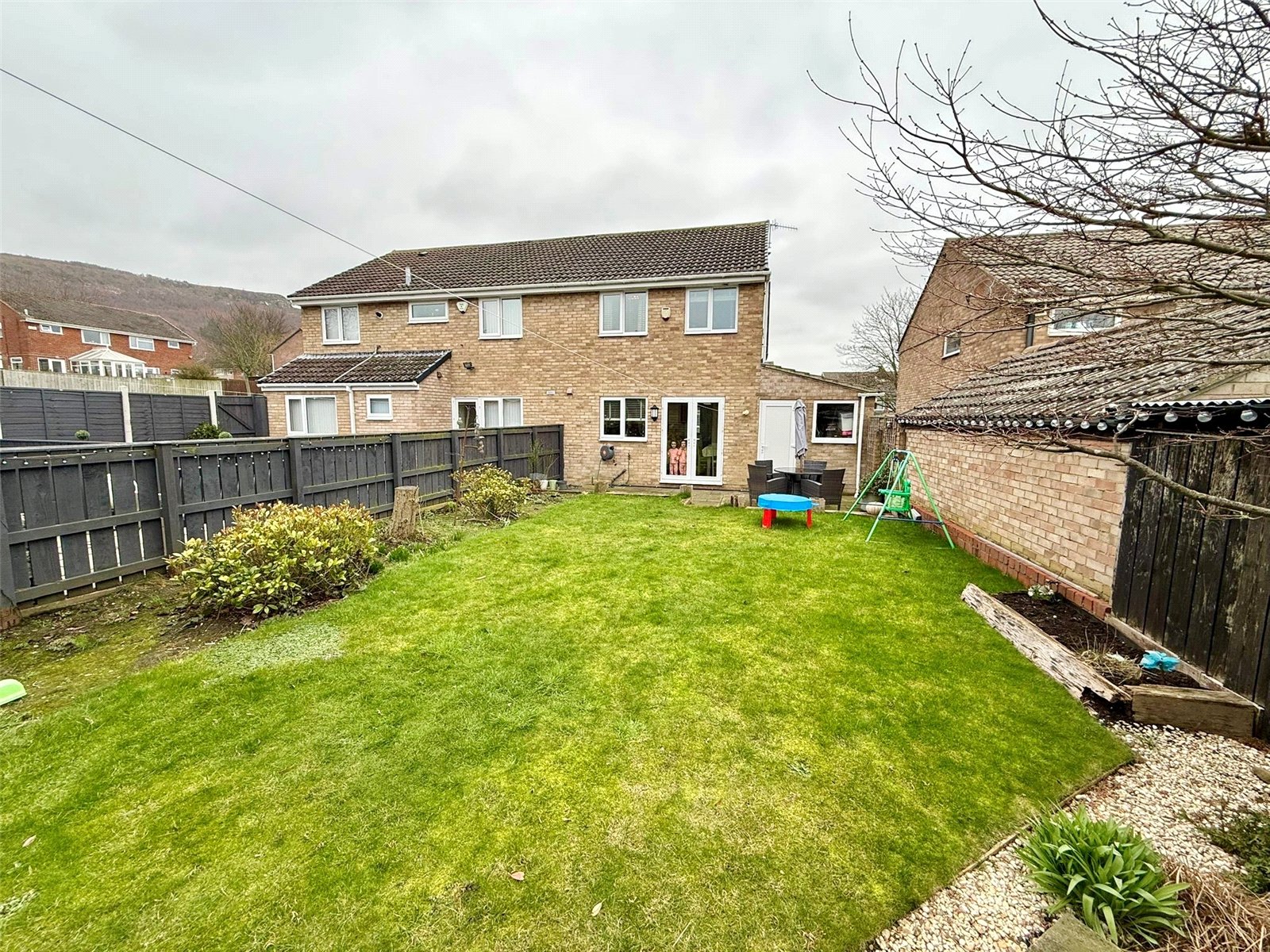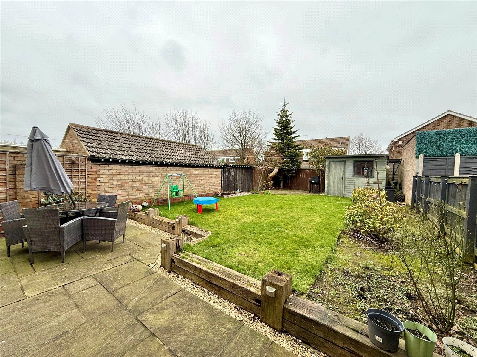 Externally, the rear garden is a standout feature — generous, enclosed and perfect for family life, with lawn and patio areas offering both play and seating space. To the front, a driveway provides off-road parking and leads to the attached garage.