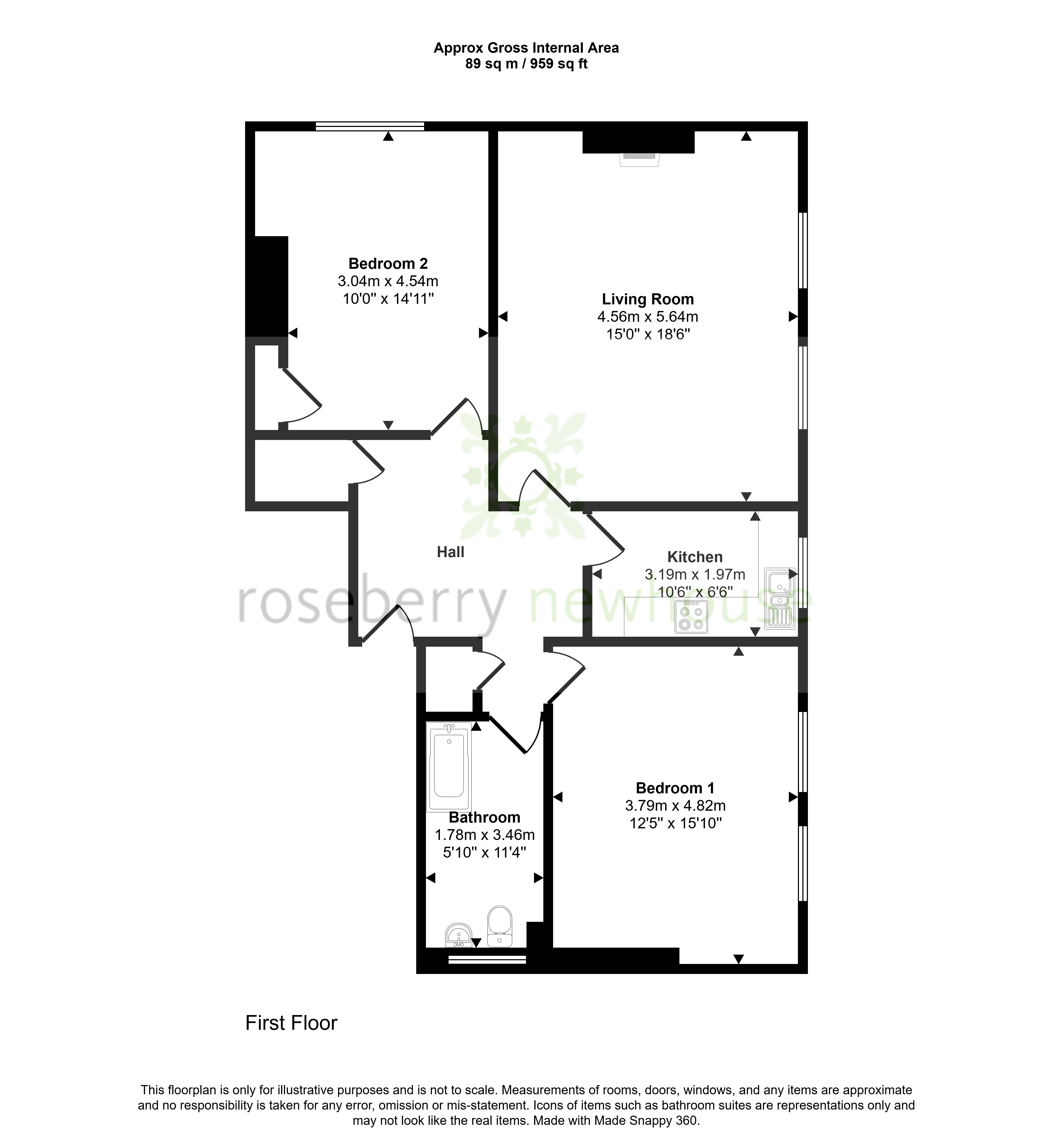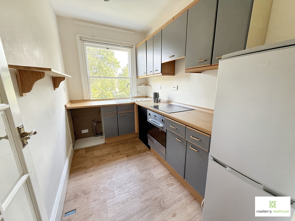 A communal entrance hallway leads to a generous living/dining room, where tall sash windows and a feature fireplace create an elegant focal point. The separate kitchen is well arranged for everyday use, while two comfortable double bedrooms are served by a neatly appointed bathroom.