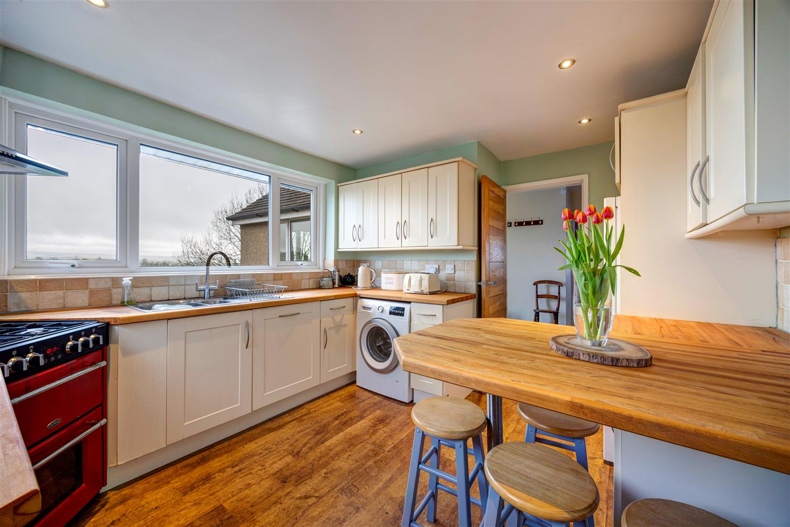 Kitchen - 3.36m x 3.44m (11'0" x 11'3") - Wood effect laminate flooring, radiator, cream shaker style wall and base units with complementary solid wood worktops, 1.5 drainer sink, gas oven, fridge freezer, washing machine, dishwasher, two double glazed windows to side and front aspects with views over Bowland.