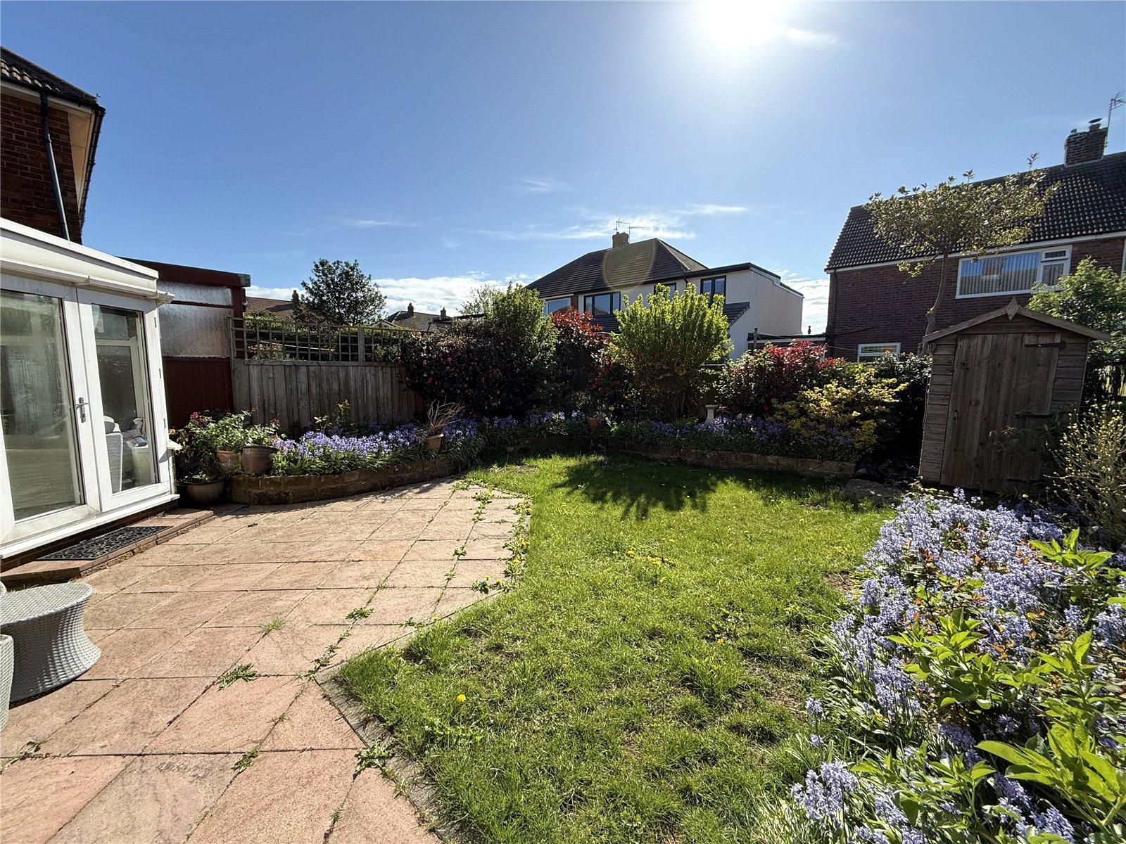 Externally, the property continues to impress. To the front, there is a block paved drive leading to the attached garage, with the front garden set behind a dwarf wall. To the rear, the west-facing garden is a great feature, enjoying afternoon and evening sun — ideal for relaxing or entertaining. It has been well arranged with an extensive patio area, lawn and mature borders, creating a private and usable outdoor space.