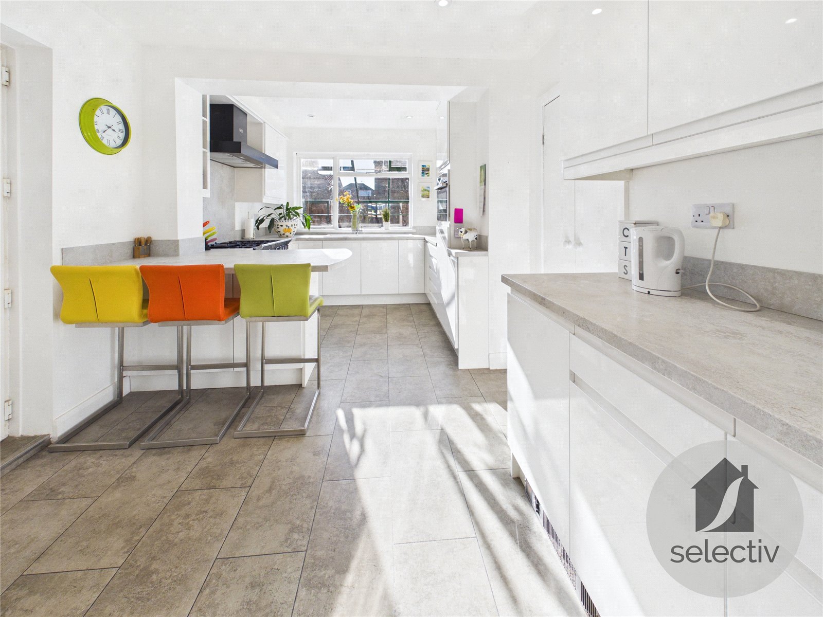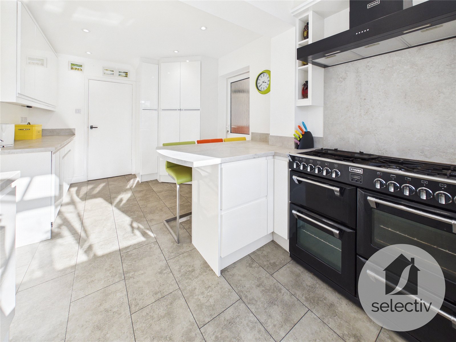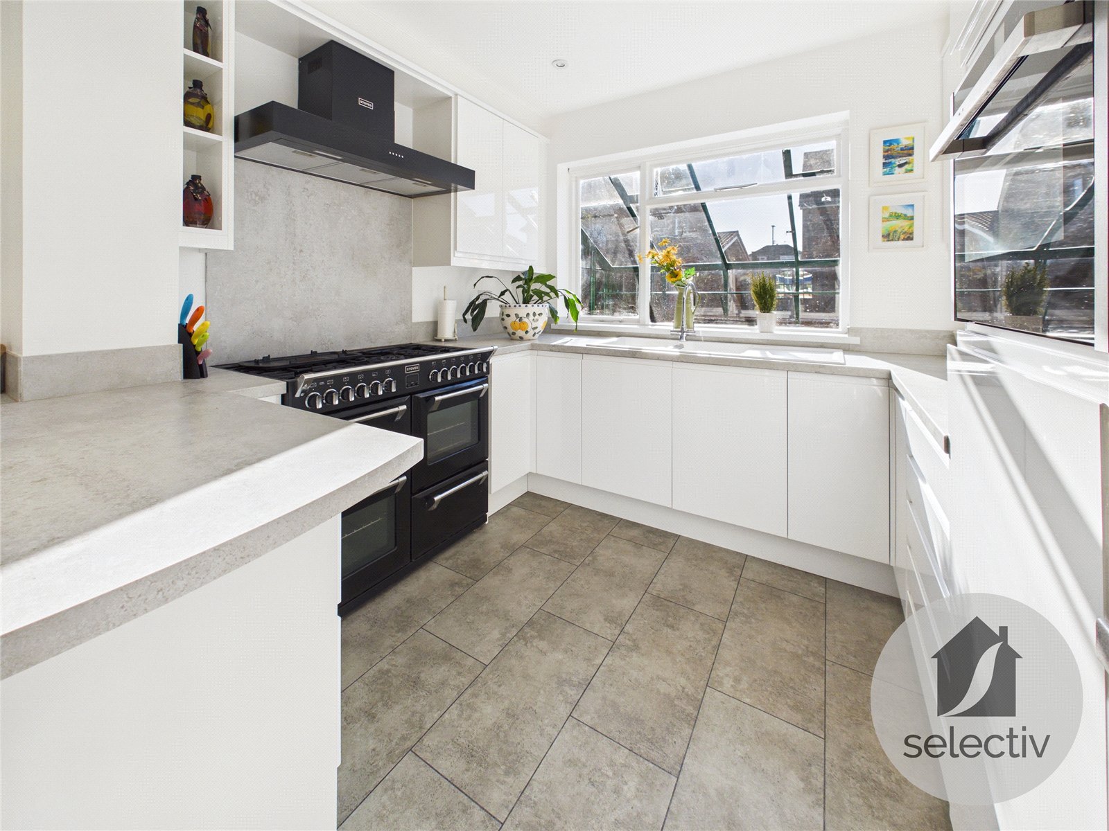 The modern kitchen / breakfast area is a real standout — stylishly fitted with sleek wall and base units, contrasting work surfaces and a range-style cooker, complemented by a breakfast bar seating area and excellent natural light. The layout works perfectly for both everyday use and entertaining.