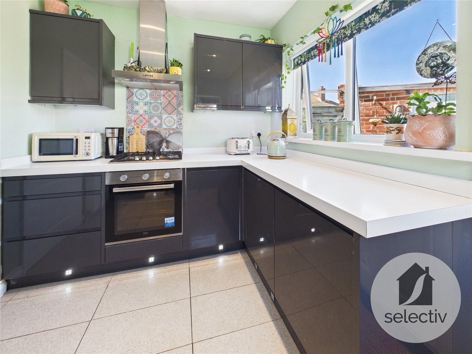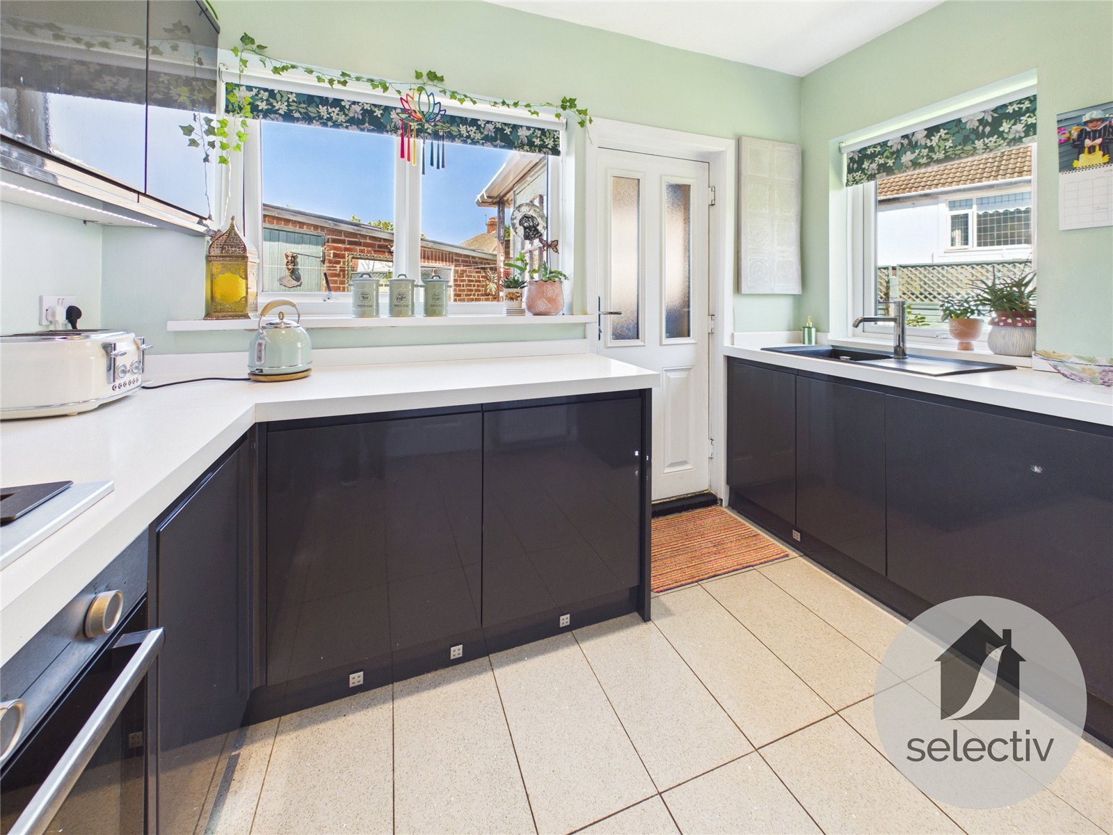 The modern fitted kitchen is well designed with a range of wall and base units, complemented by built-in appliances and direct access out towards the rear garden—ideal for everyday convenience.