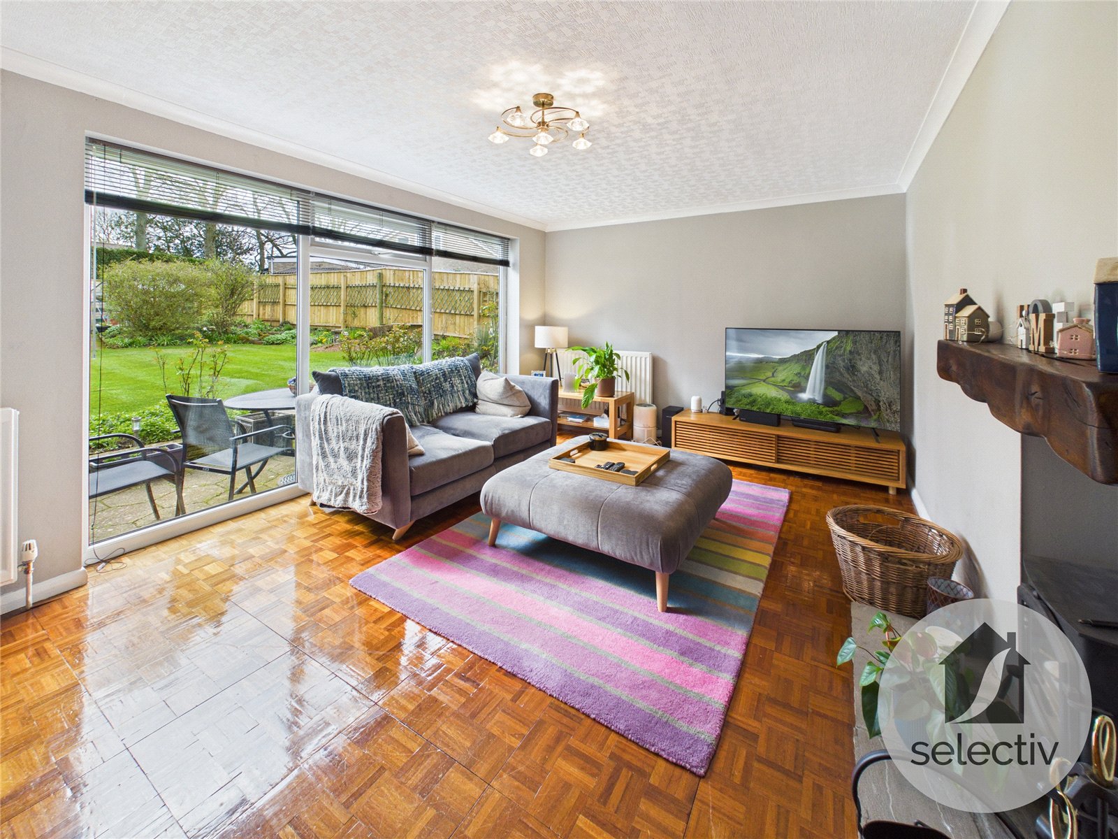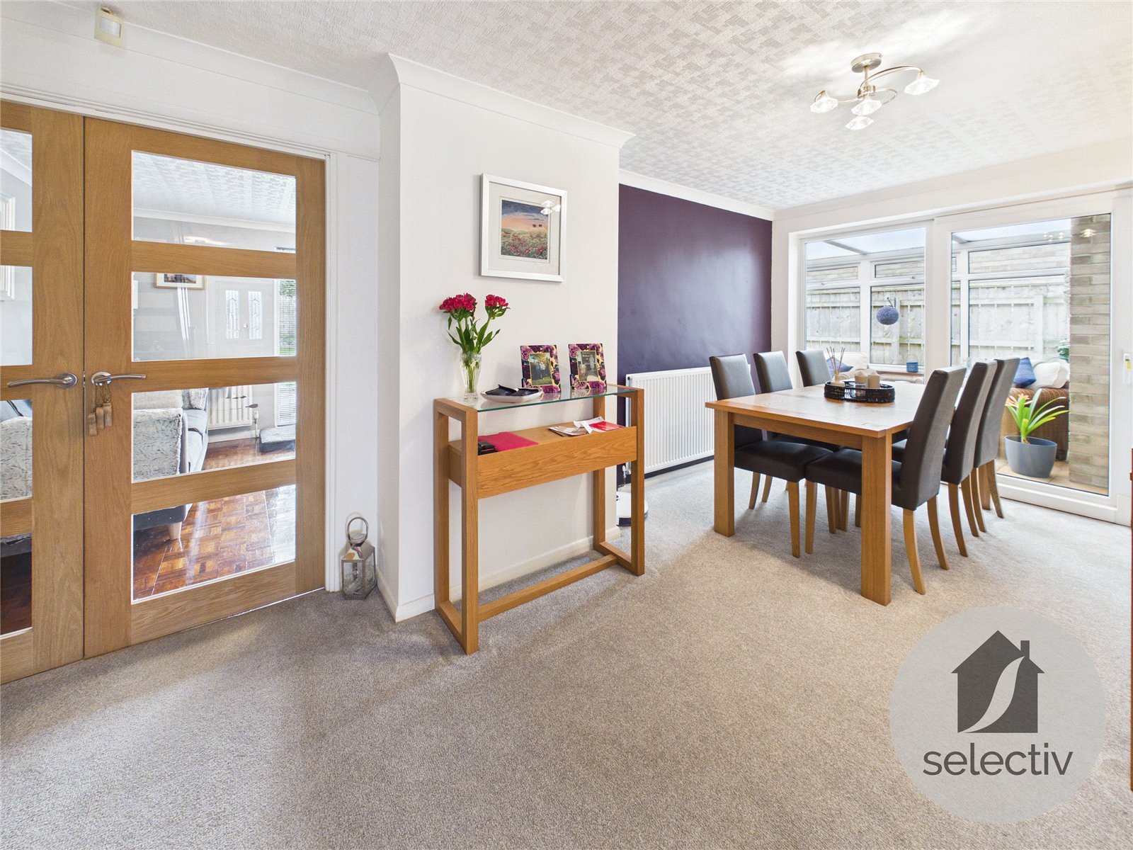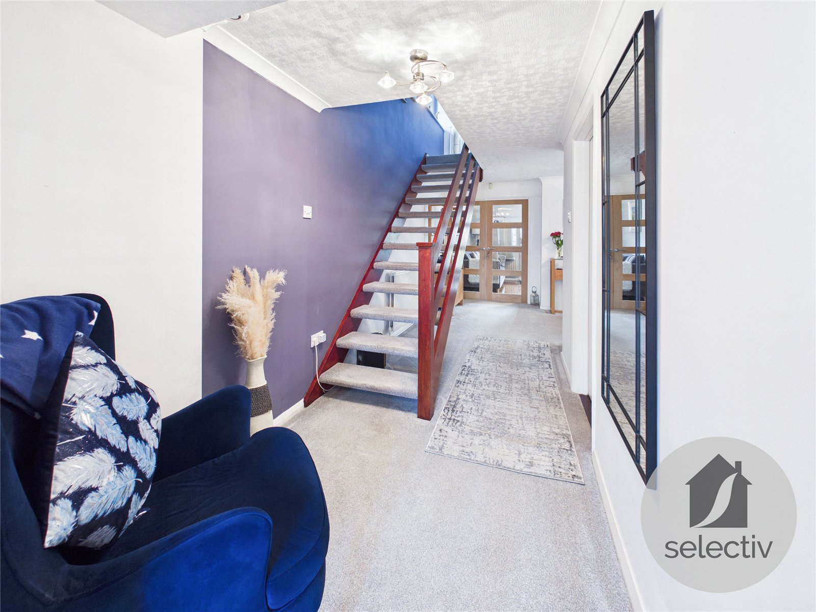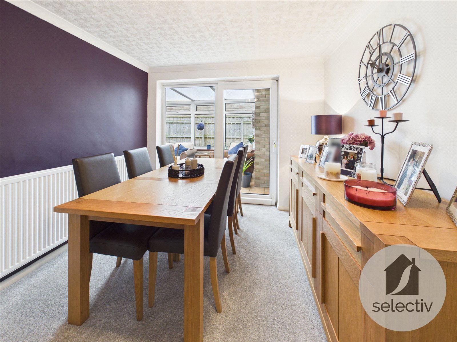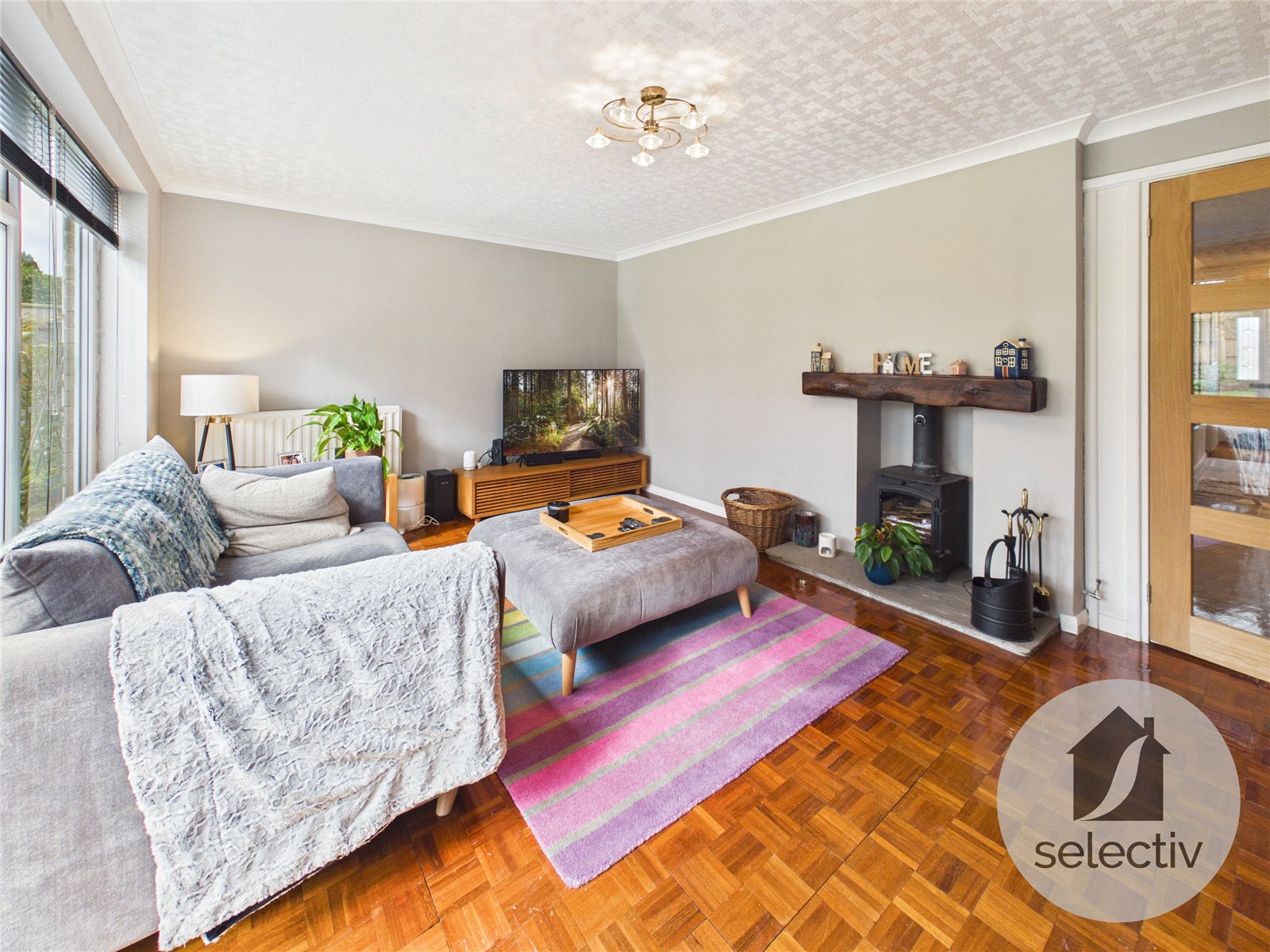 A welcoming hallway with cloakroom/WC and open tread staircase sets the tone, leading through to a versatile dining area / family room with patio doors opening into a conservatory — creating an ideal space for entertaining or everyday family life. The living room enjoys a lovely rear aspect, complete with a multi-fuel burner and picture window framing views over the garden.