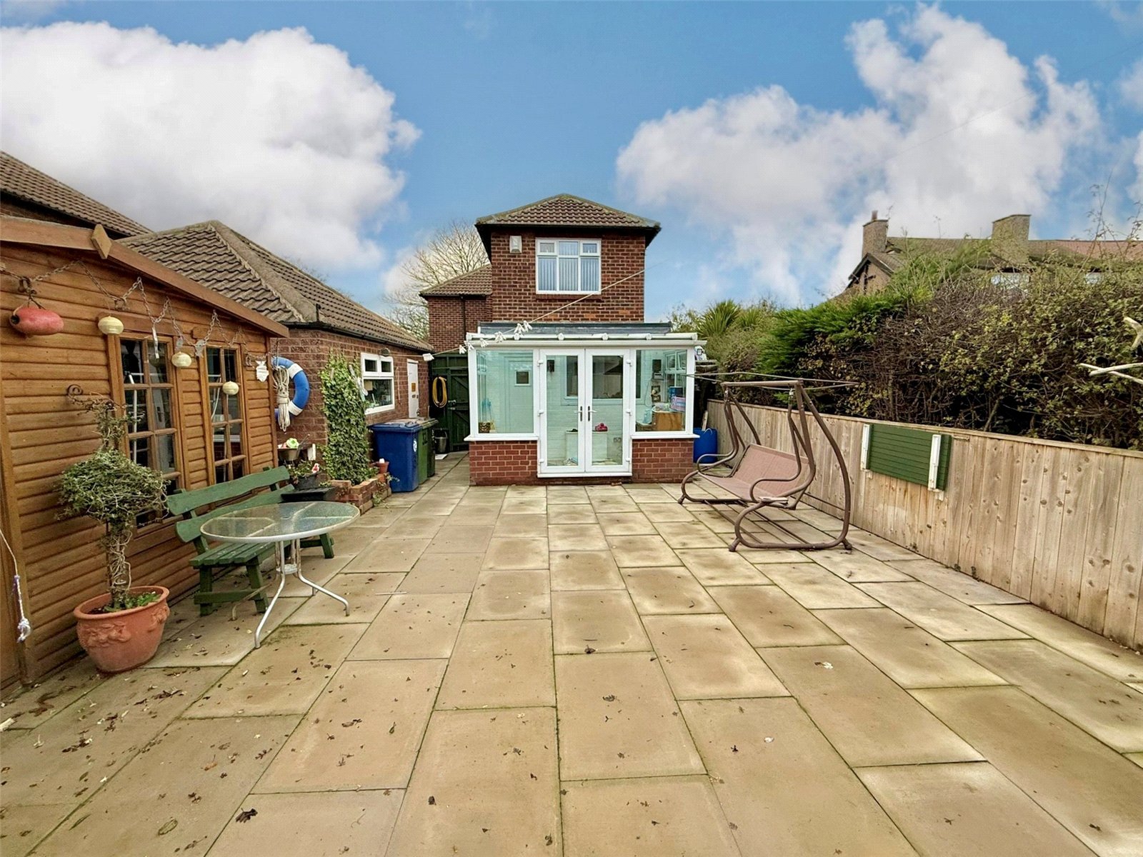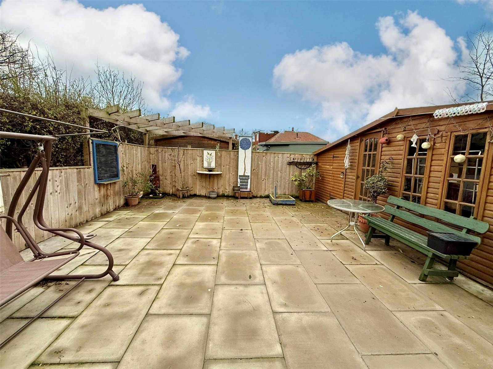 Externally, the property truly stands out. The front and side gardens are mainly laid to lawn, set behind a dwarf wall, enhancing the home’s kerb appeal while offering excellent outdoor space. The enclosed SOUTH FACING rear garden is predominantly paved for low maintenance and is ideal for outdoor dining and entertaining, further benefiting from a summer house / additional storage. A detached garage provides secure parking or further storage options.
