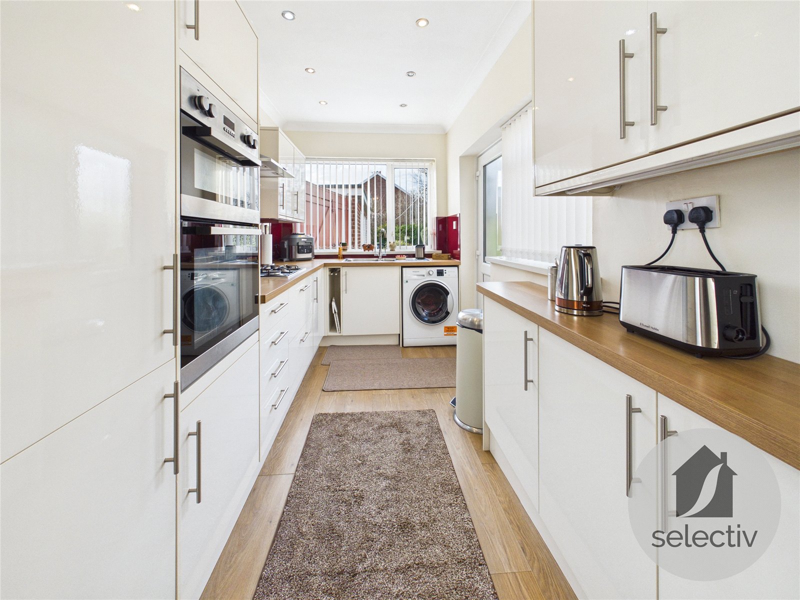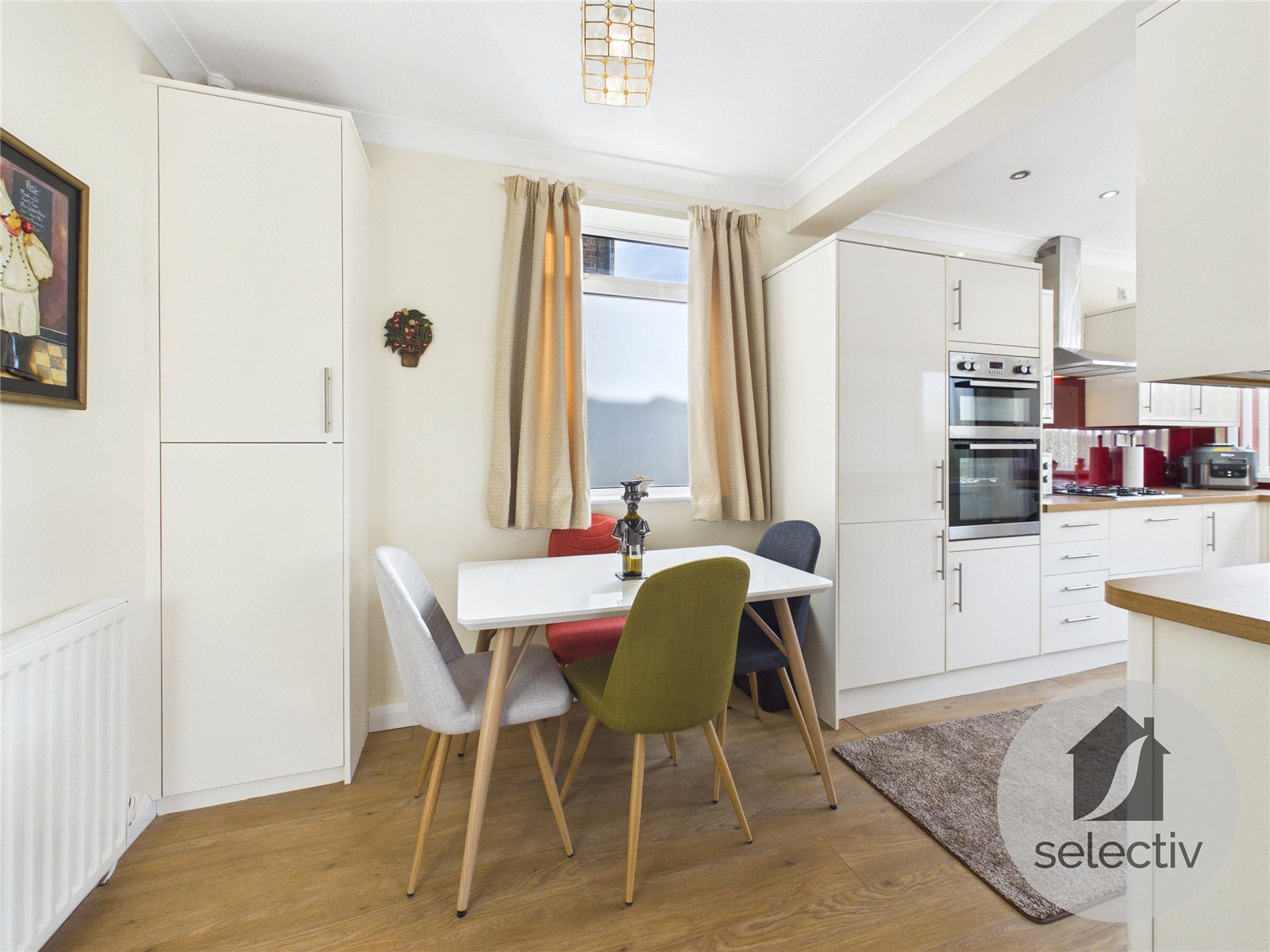 To the rear, the modern kitchen is finished in clean, neutral tones with quality wall and base units, wood-effect worktops and integrated appliances. It opens into a defined dining area, creating a practical and sociable layout ideal for everyday family life.