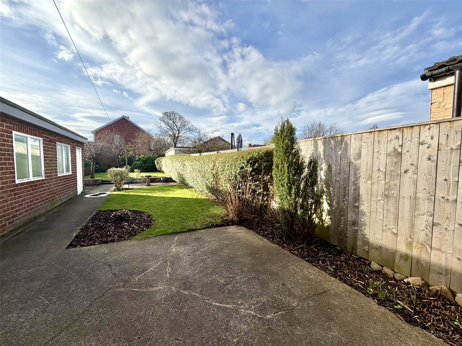 A neat lawned frontage sits behind a dwarf wall, while the long side driveway provides ample off-road parking and leads to a detached garage.