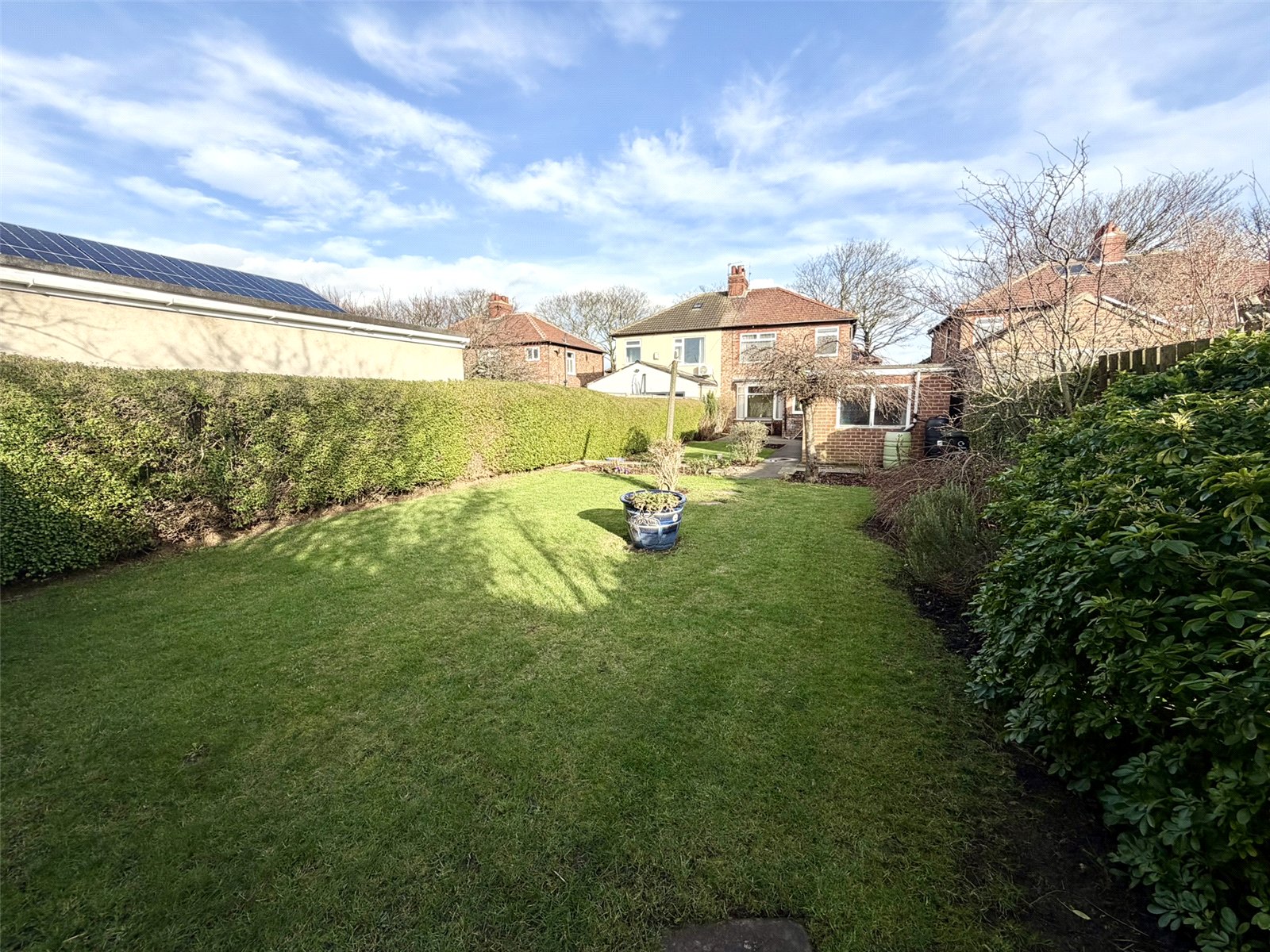 The west-facing rear garden is a true standout — beginning with patio space and opening onto a generous lawn framed by mature hedging, offering privacy and excellent afternoon and evening sunlight.
