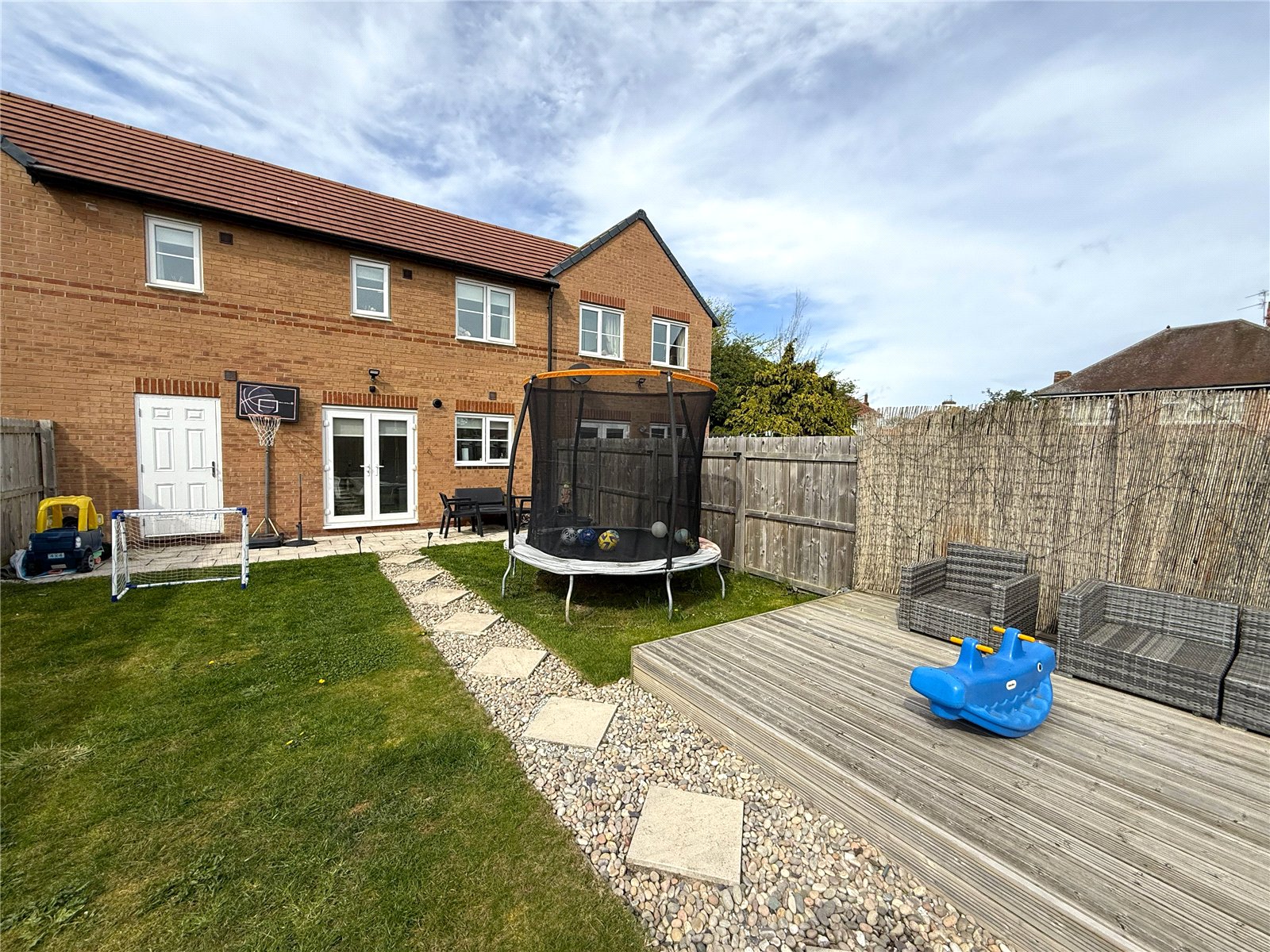 The rear garden is a real highlight—a great size and ideal for families, featuring a patio seating area, lawn, and a decked area to one side, offering a perfect space to relax and entertain.