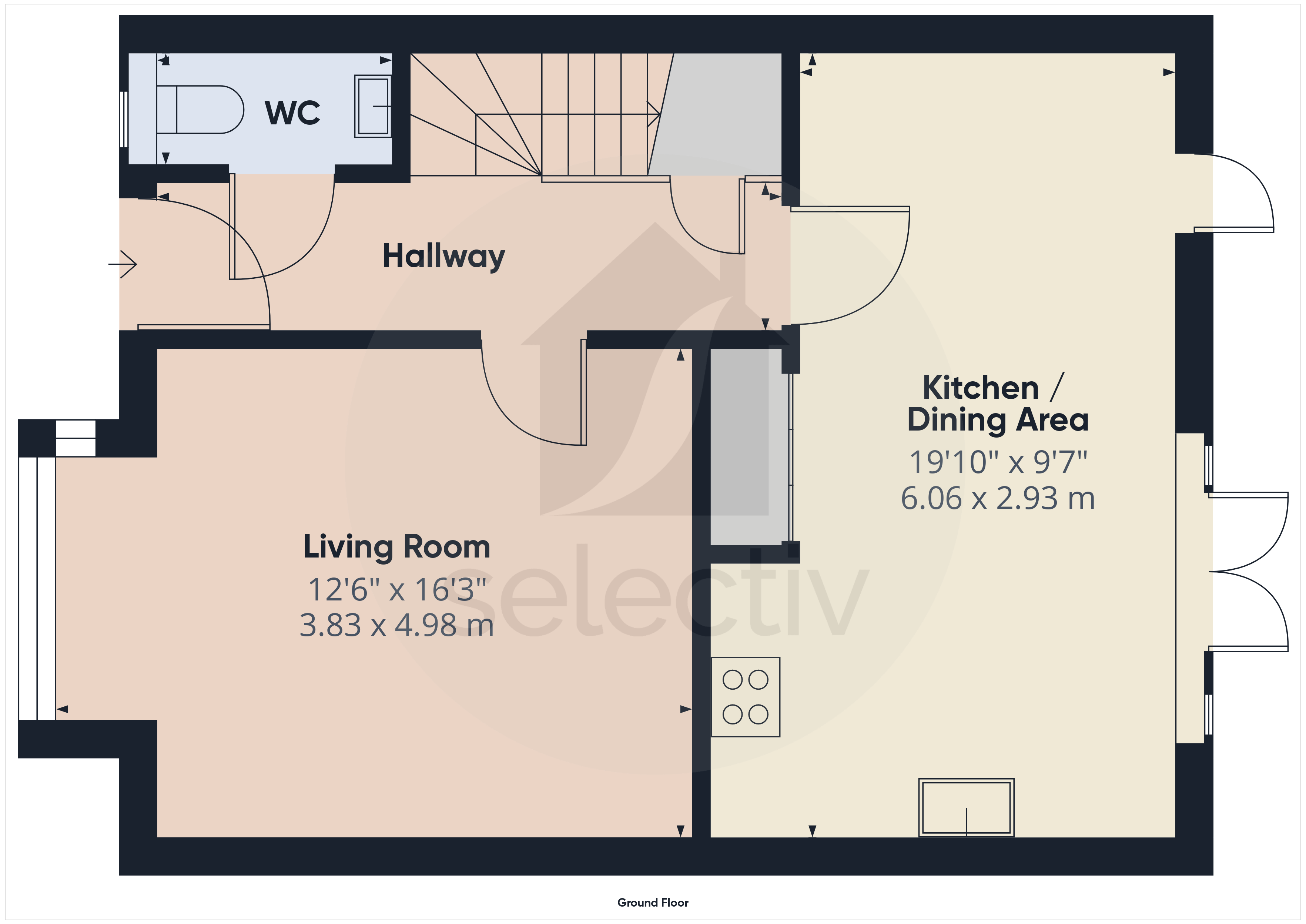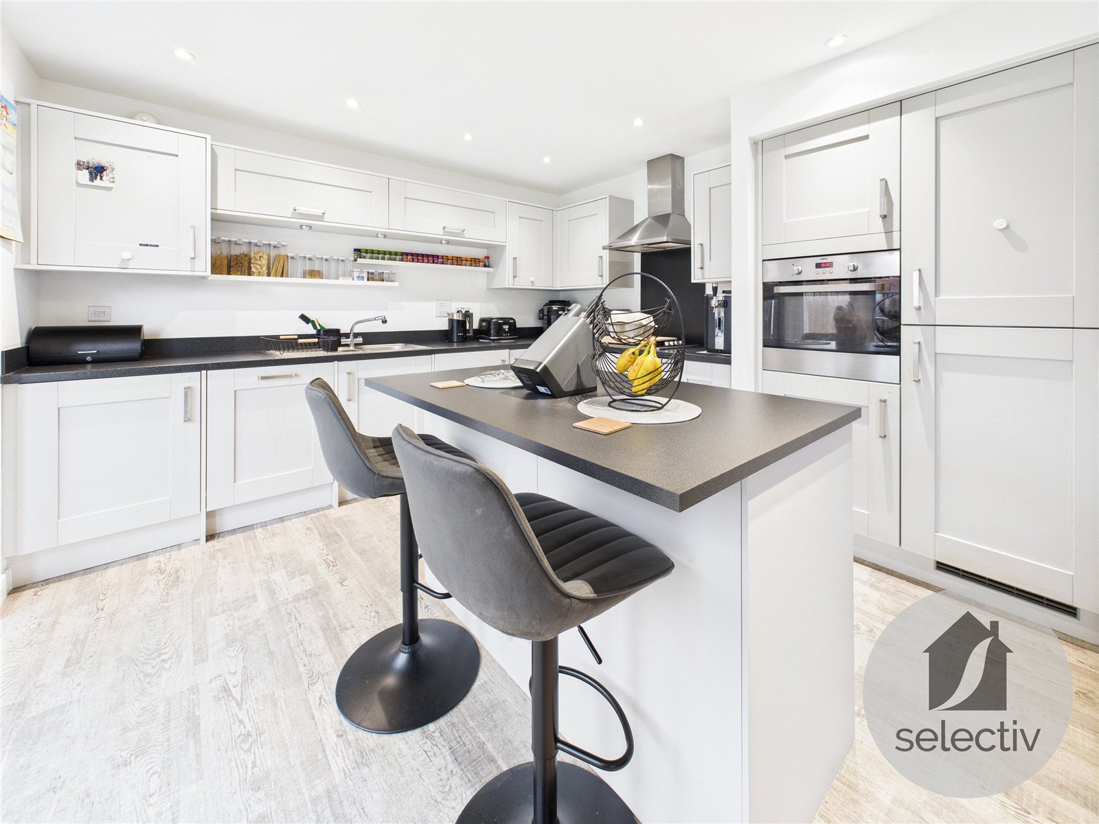 Step inside to find a welcoming entrance hall, a convenient downstairs cloakroom/WC, and a bright bay-fronted living room complemented by a bespoke built-in storage unit. The stunning fitted kitchen/dining room boasts a suite of integrated appliances and graceful French doors that create a seamless flow to the lovely rear garden.