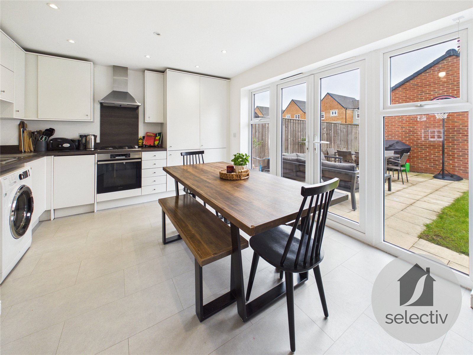 To the rear of the property is a modern kitchen / dining area, fitted with a range of wall and base units and offering plenty of space for everyday dining. French doors open directly onto the rear garden, allowing natural light to flood the room and creating a wonderful connection between indoor and outdoor living.