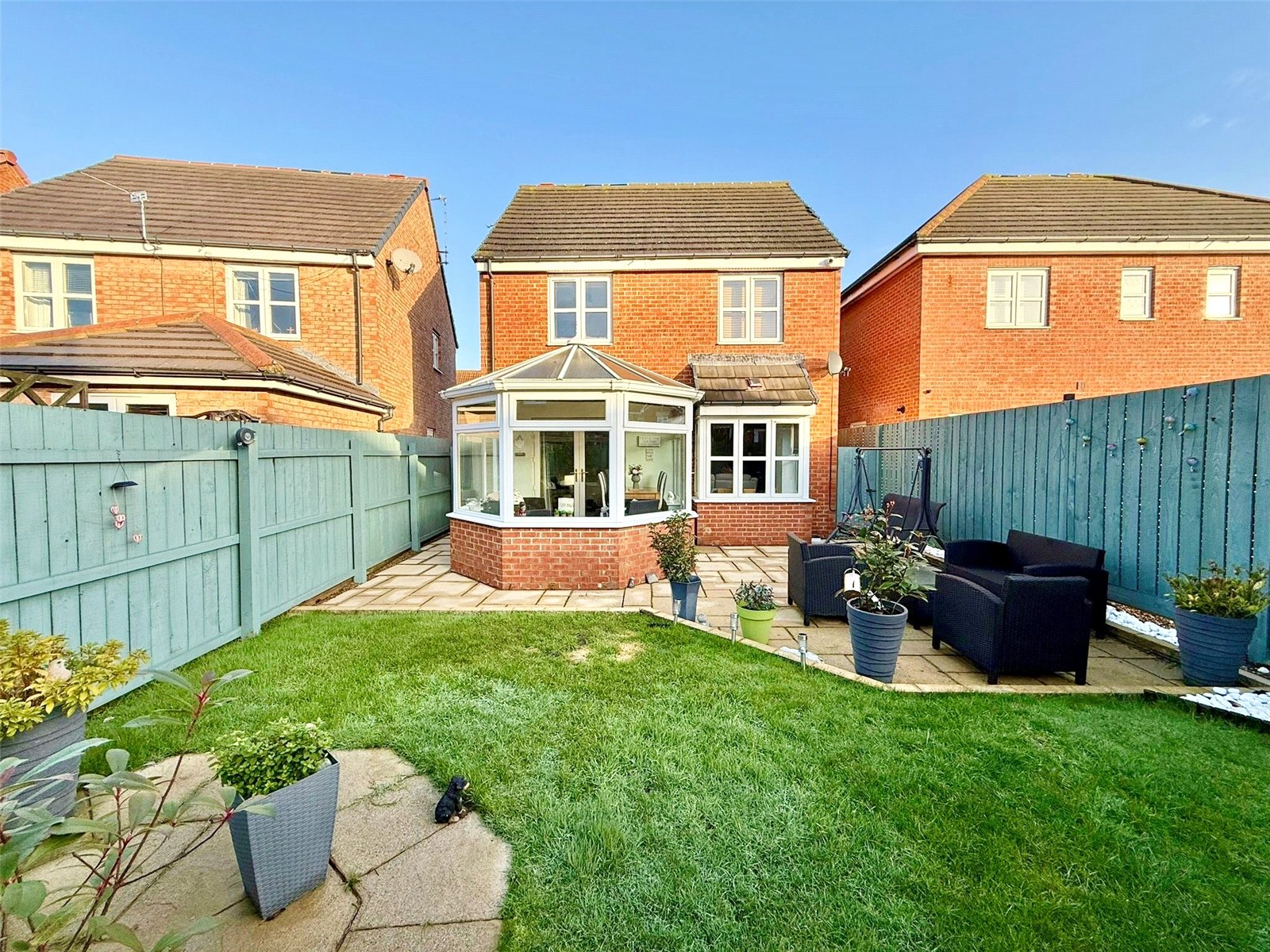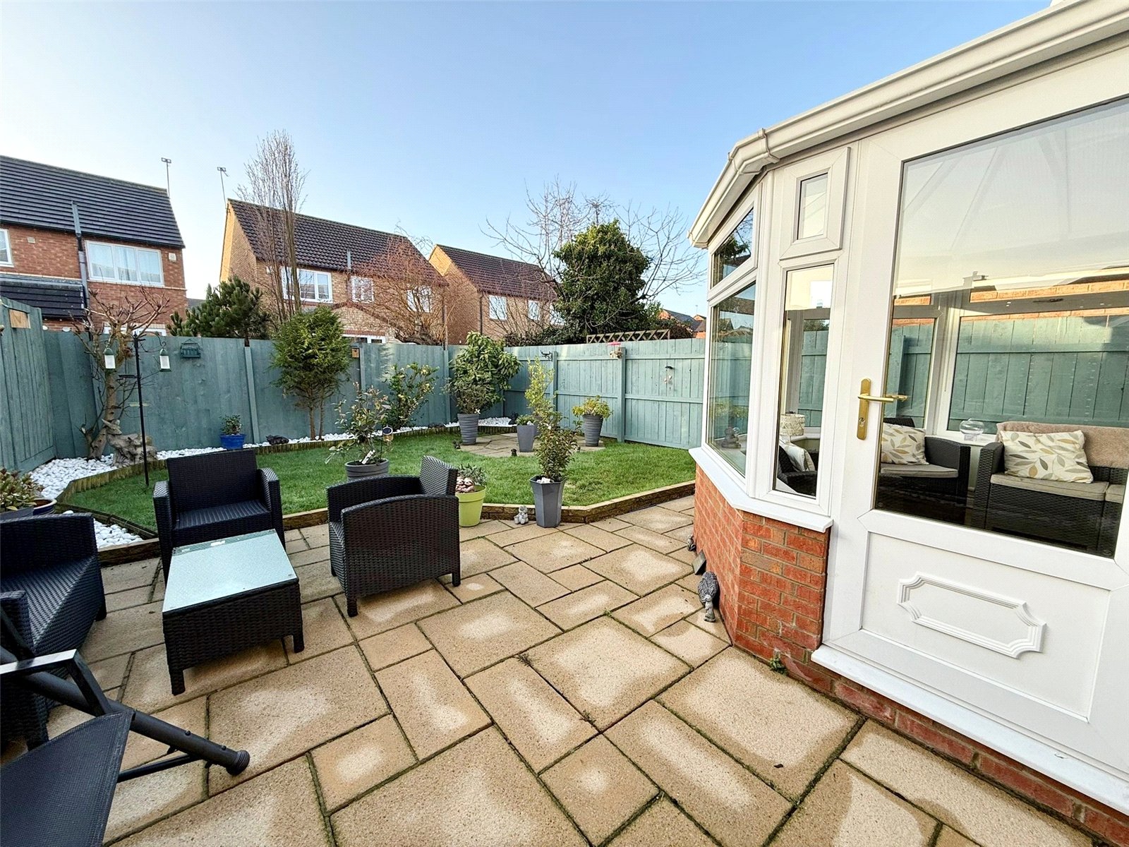 Externally, there is a double width block paved driveway providing excellent off-road parking and leading to the integral garage. The open lawn to the front adds to the kerb appeal, but the true showstopper is the superb SOUTH FACING landscaped rear garden — a gorgeous sun-trap which begins with an attractive patio, extending to a mainly lawned garden with a further seating patio to the rear… perfect for summer evenings and outdoor living.