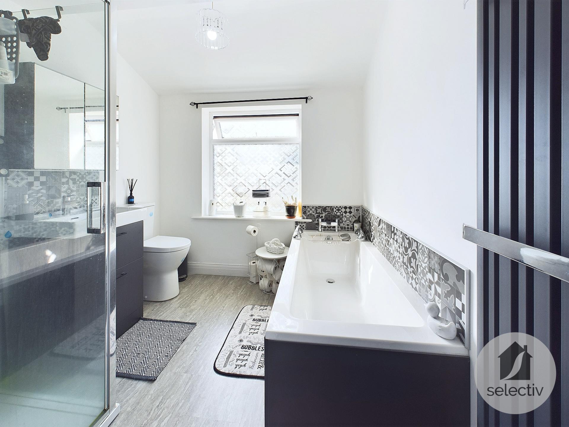 Inside, there’s a bright bay-fronted lounge to the front, followed by a long modern kitchen/diner to the rear with French doors opening out to the garden — ideal for day-to-day life and entertaining. A particularly useful bonus is the ground-floor bathroom alongside a separate WC, giving the home flexibility that’s not often found in properties of this style.