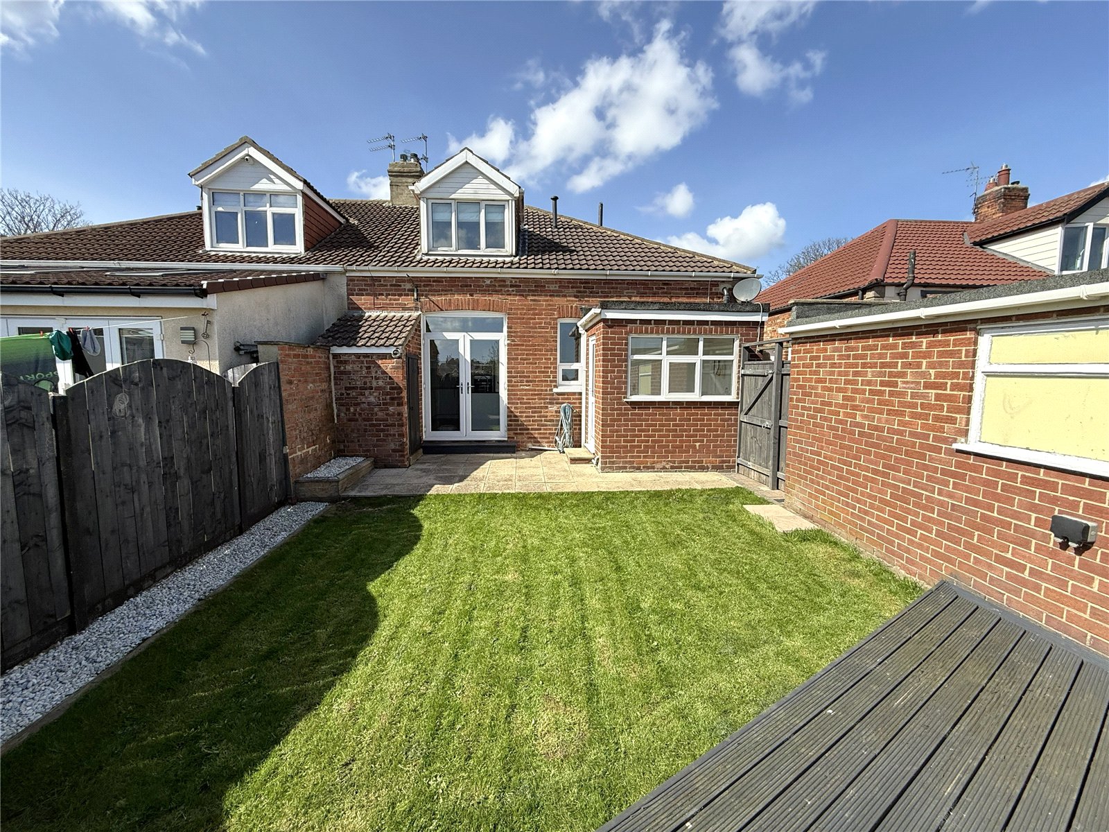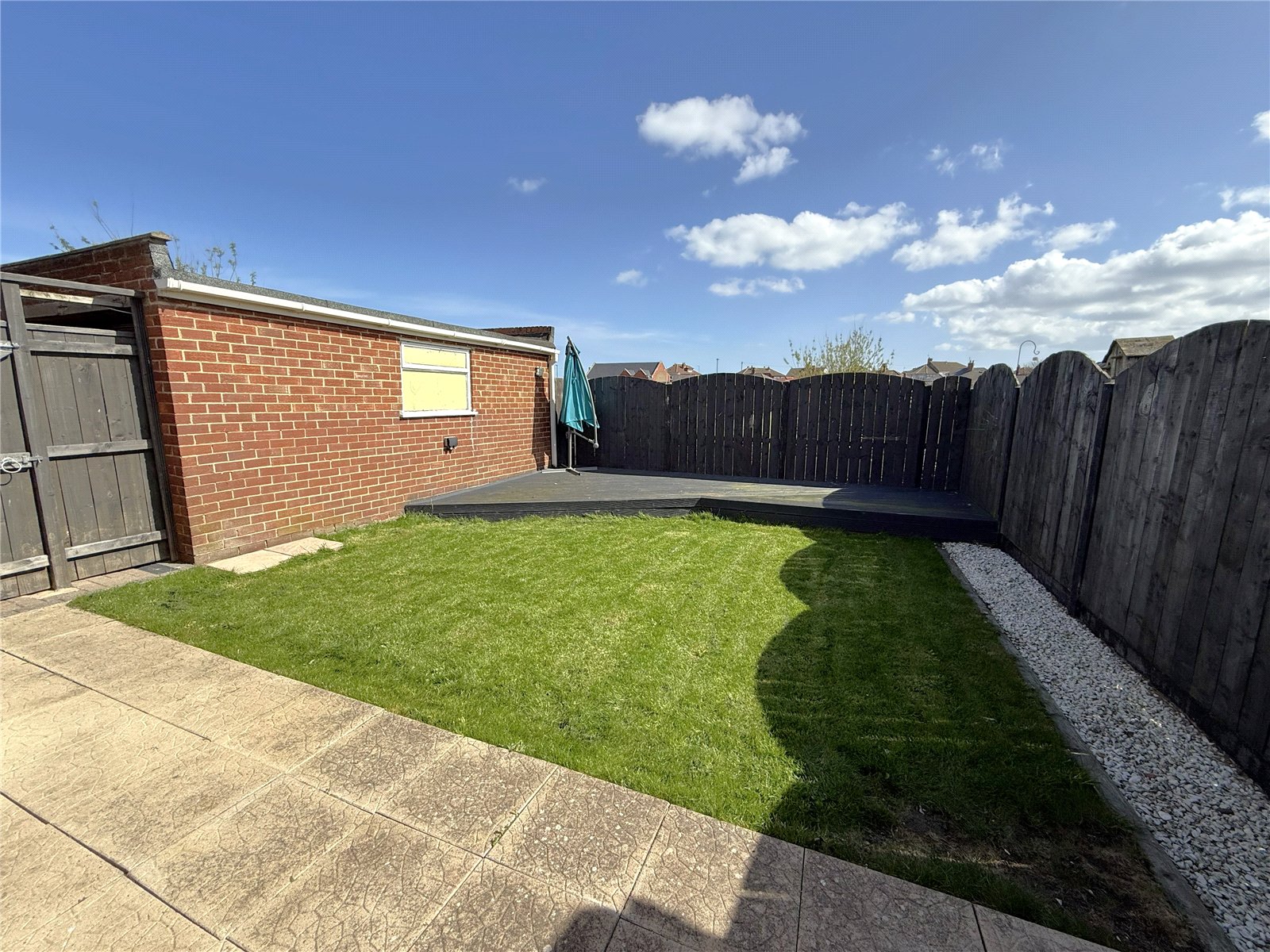 Externally, the property continues to stand out. A block paved driveway and gravelled frontage create a smart, low-maintenance approach, while the rear garden has been thoughtfully designed for both relaxation and entertaining — with a patio area, lawn, and a decked seating space perfectly positioned to catch the sun.