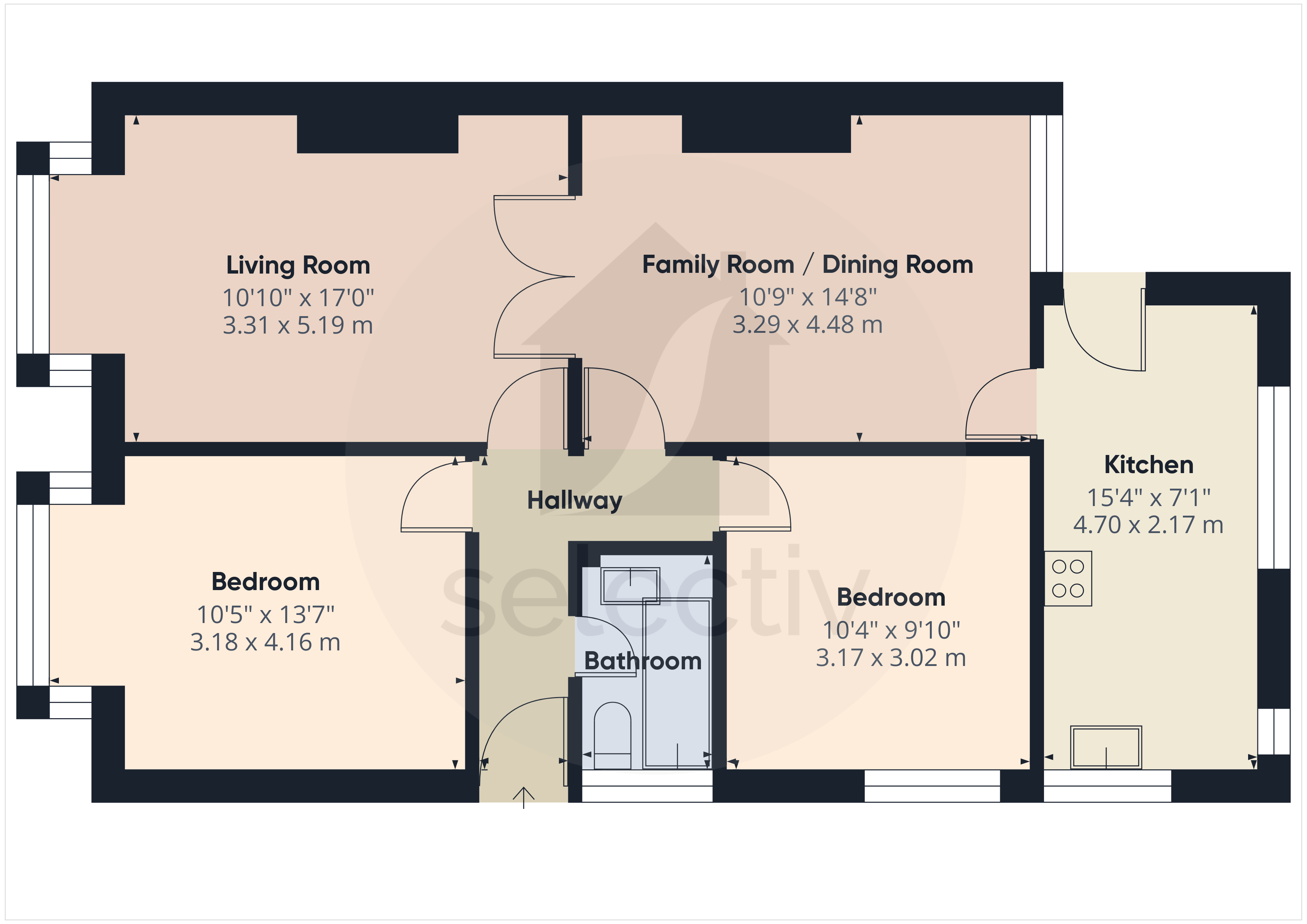 The accommodation briefly comprises an entrance hall leading to a bright and comfortable living room, a versatile family room or dining room, and a modern fitted kitchen. There are two generous double bedrooms and a stylish bathroom with WC.