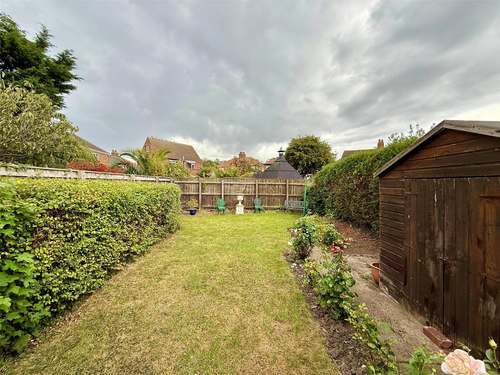 Externally, the property benefits from an attractive front garden and a well-planned rear garden with a patio area and a good-sized lawn, ideal for relaxation or outdoor entertaining.