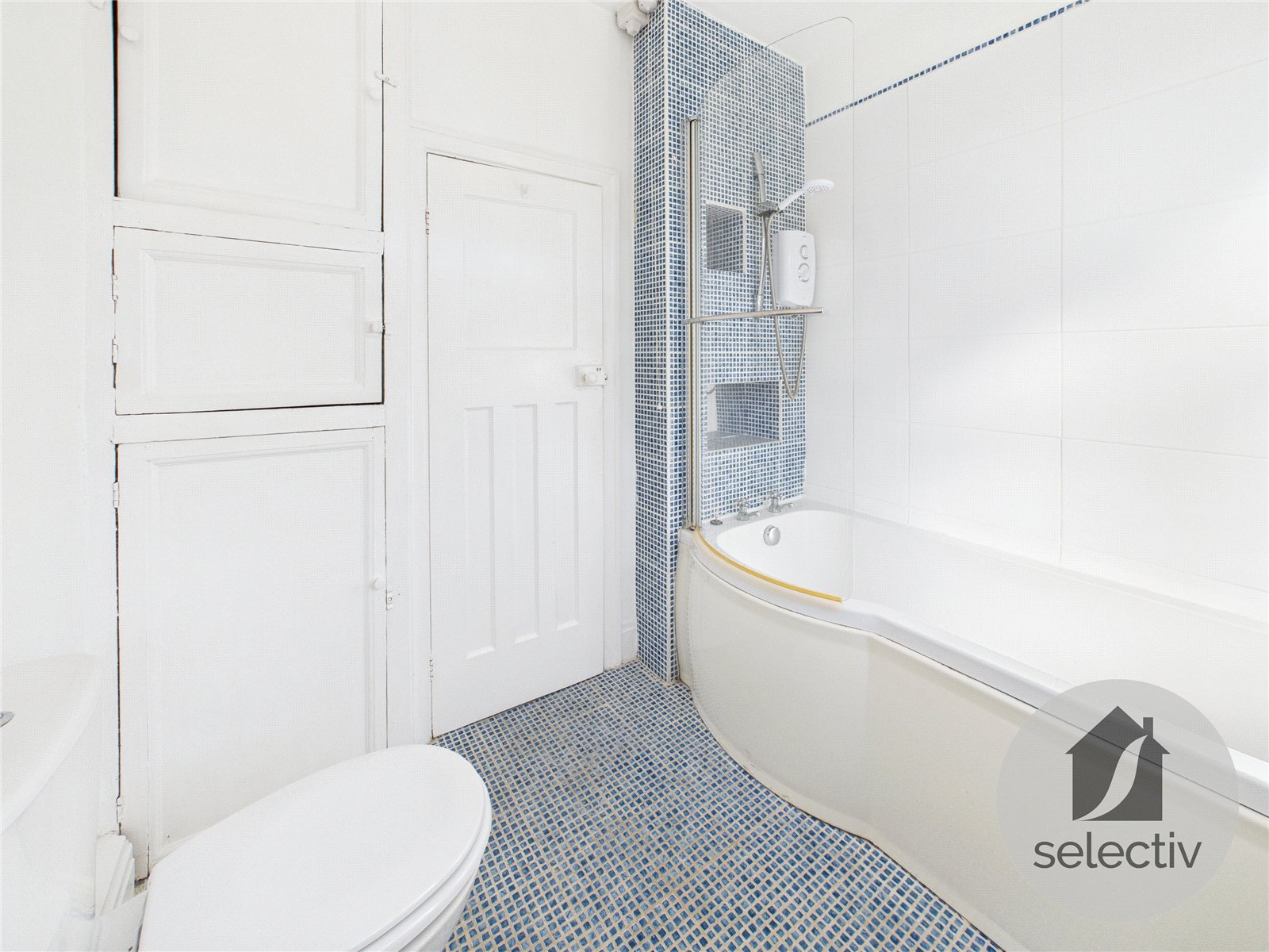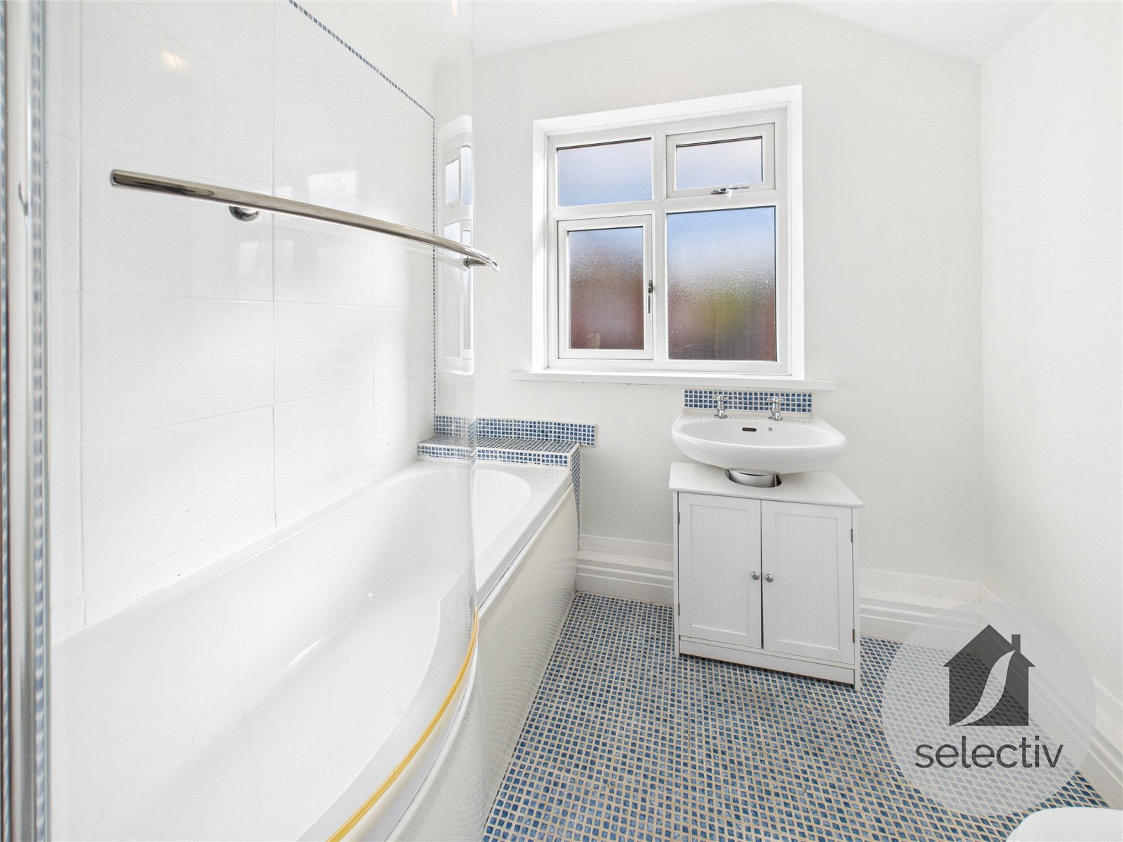 Upstairs, the landing leads to two generous double bedrooms, the front bedroom enjoying a bay window that adds charm and natural light. The bathroom / wc includes a white suite with a shower over the bath.