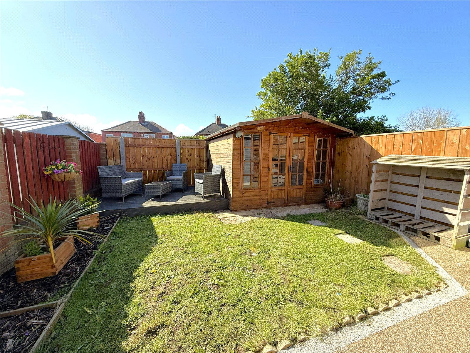 Externally, the rear garden is perfectly set up for lifestyle. Enjoying a west-facing aspect, it captures the best of the afternoon and evening sun, with a well-designed layout featuring lawn, a raised decked seating area and a substantial summer house — ideal for relaxing, entertaining or working from home.