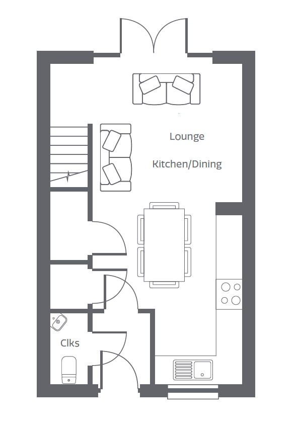 Designed for modern living, this home offers a bright and spacious open plan living area incorporating kitchen, dining and living space — ideal for everyday living and entertaining alike. Integrated oven, hob and extractor are included, while French doors open directly onto the rear garden, creating a seamless indoor / outdoor feel. A downstairs cloakroom adds practical convenience.