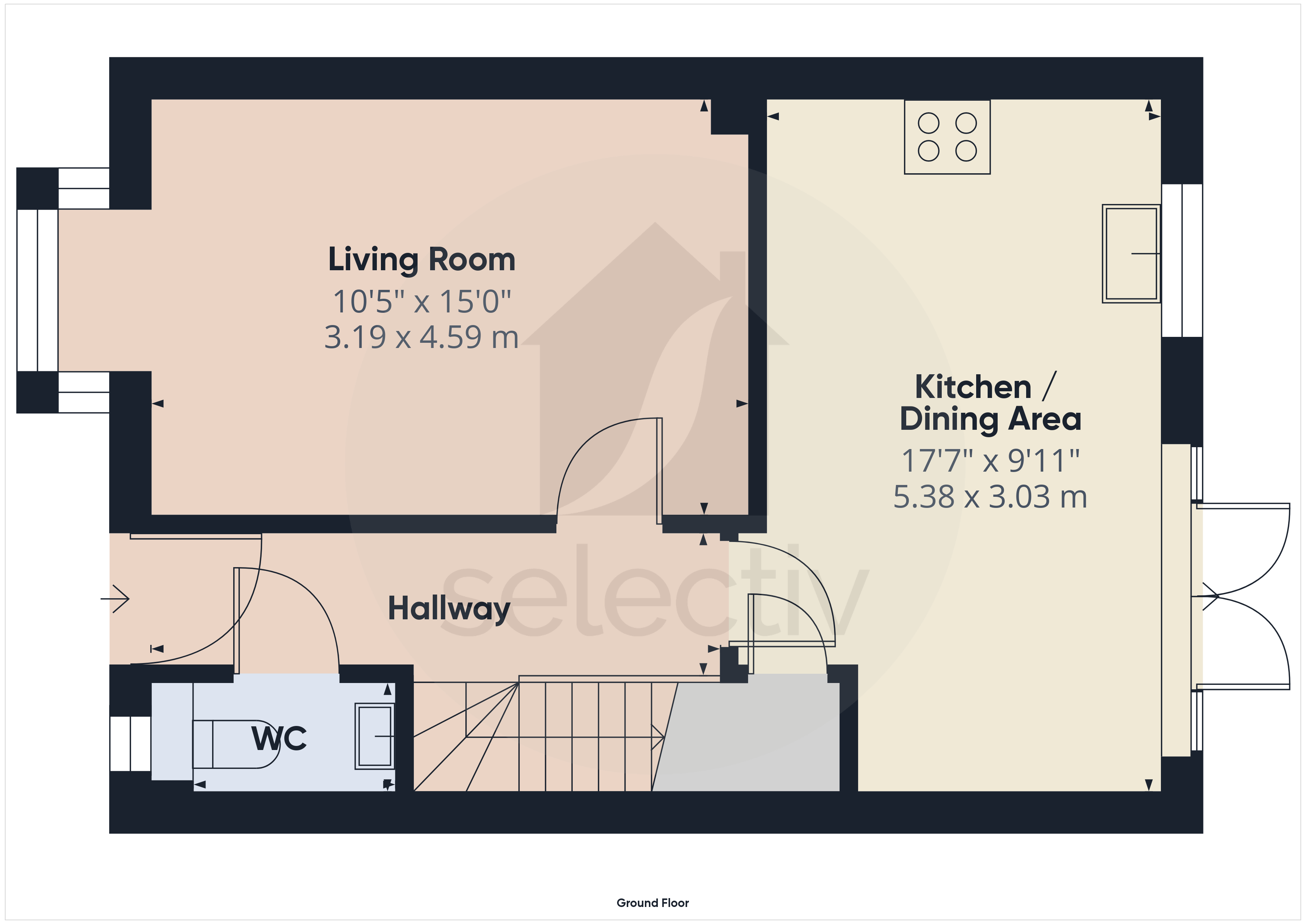 The ground floor offers a welcoming entrance hall, a spacious living room filled with natural light, and to the rear, a superb full-width kitchen / dining area finished in sleek modern tones with integrated appliances and French doors opening directly onto the garden — perfect for everyday living and entertaining. A downstairs WC completes the layout.